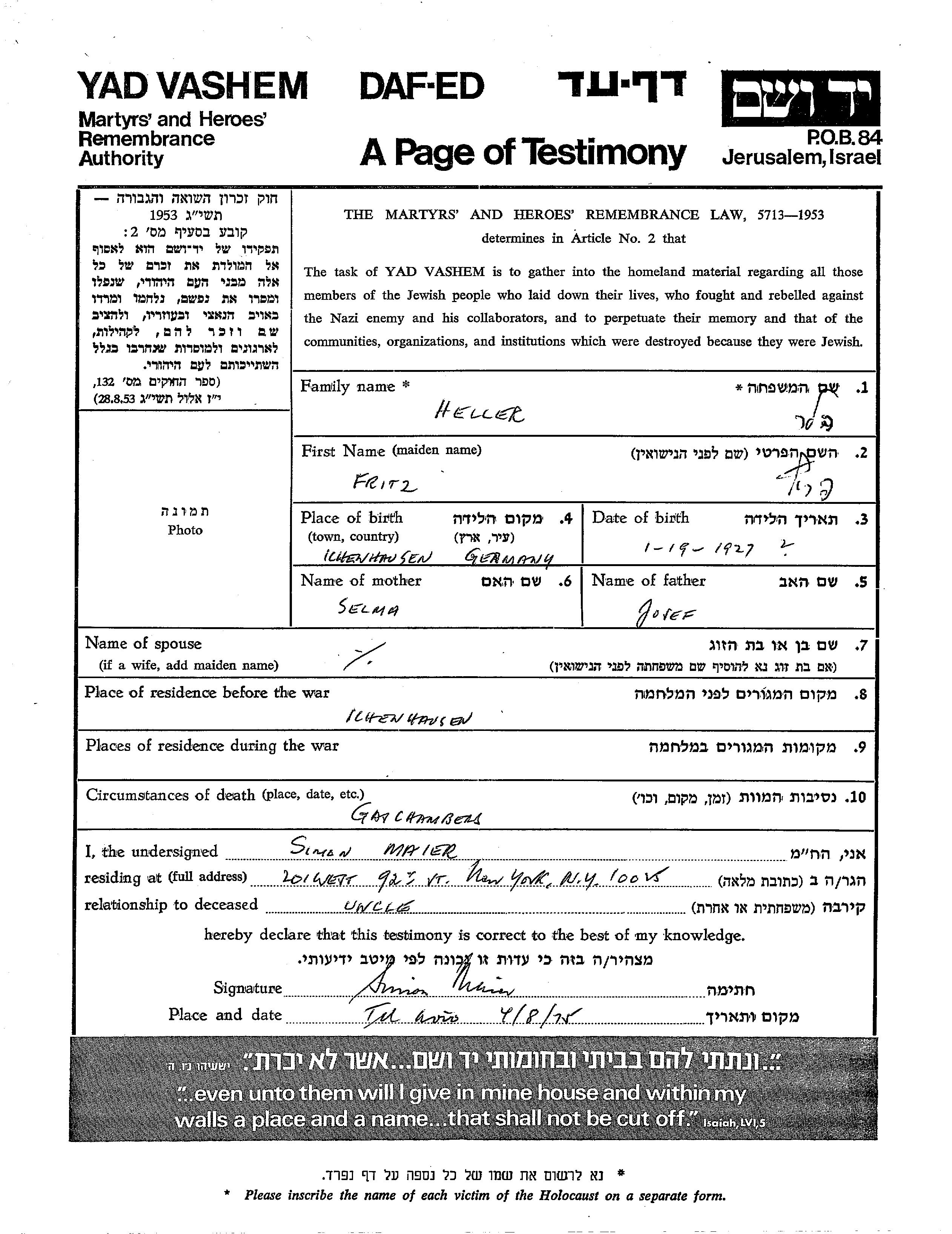 Фриц Хеллер, место рождения: Ихенхаузен, Германия. Отец: Йосеф, mать:Сельма. Место жительства до войны: Ихенхаузен, Германия.