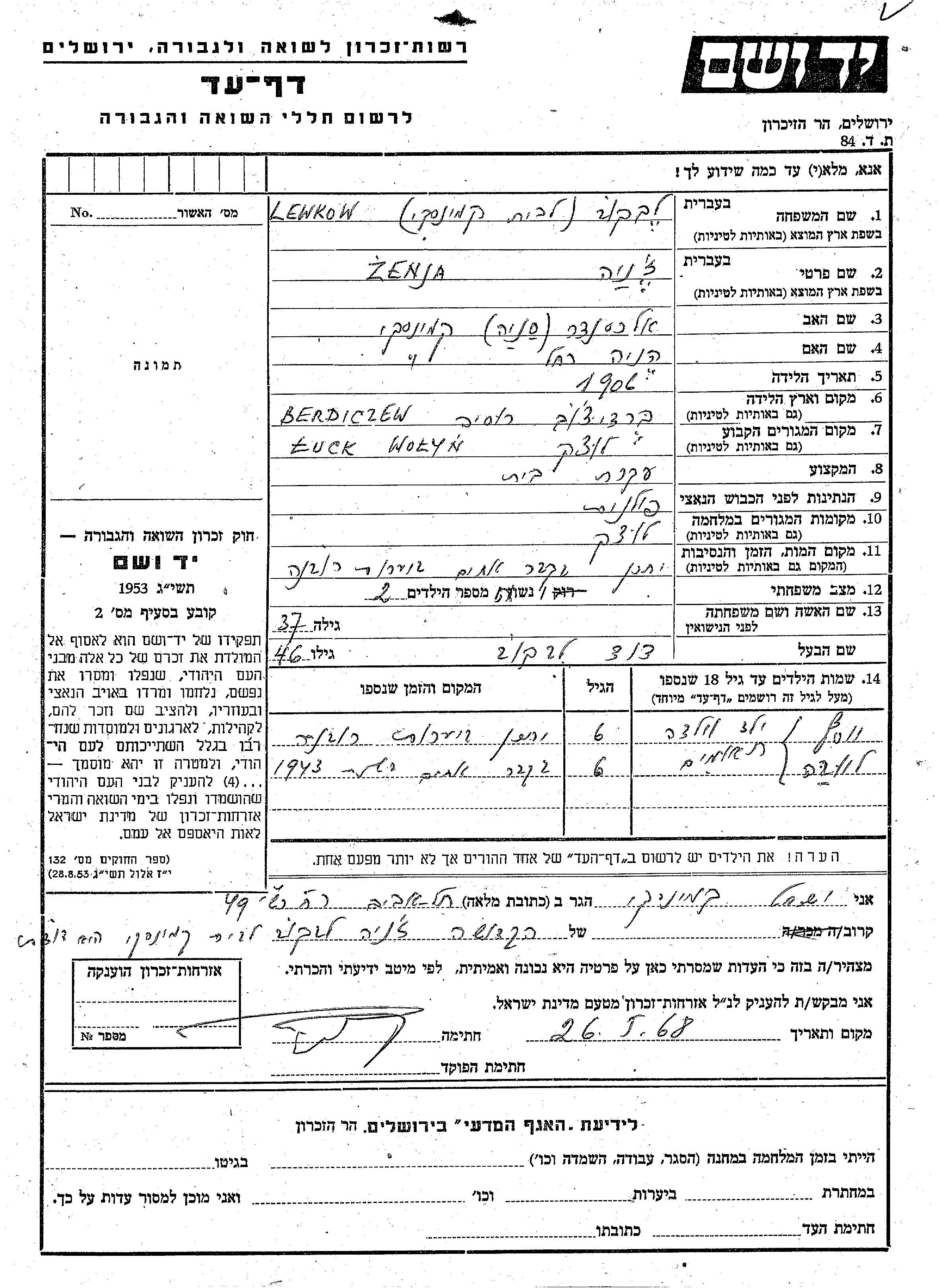 Женя Левков, девичья фамилия Камински, место рождения: Бердичев, Украина (СССР). Отец: Александер, mать:Хеня Рахель. Домохозяйка. Женат / замужем. Место жительства до войны: Луцк, Польша. Место во время войны: Луцк, Польша.