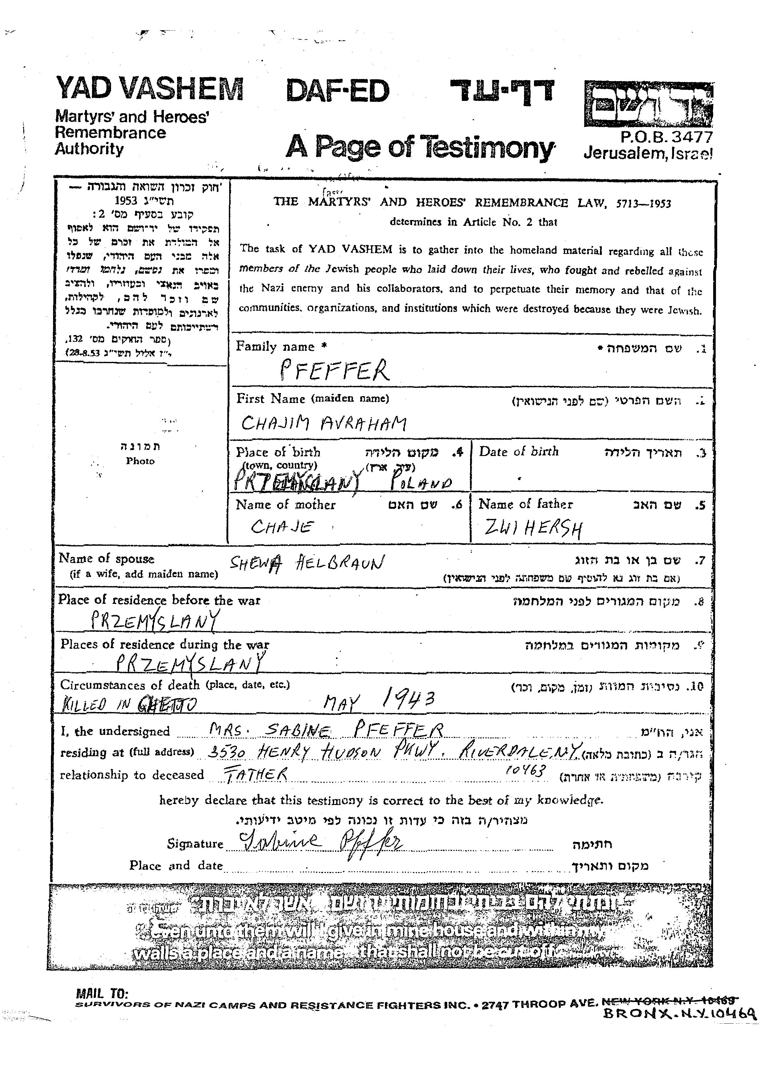 Хаим Авраам Феффер, место рождения: Перемышляны, Польша. Отец: Цви Герш, mать:Хая. Женат / замужем. Место жительства до войны: Перемышляны, Польша. Место во время войны: Перемышляны, Польша.