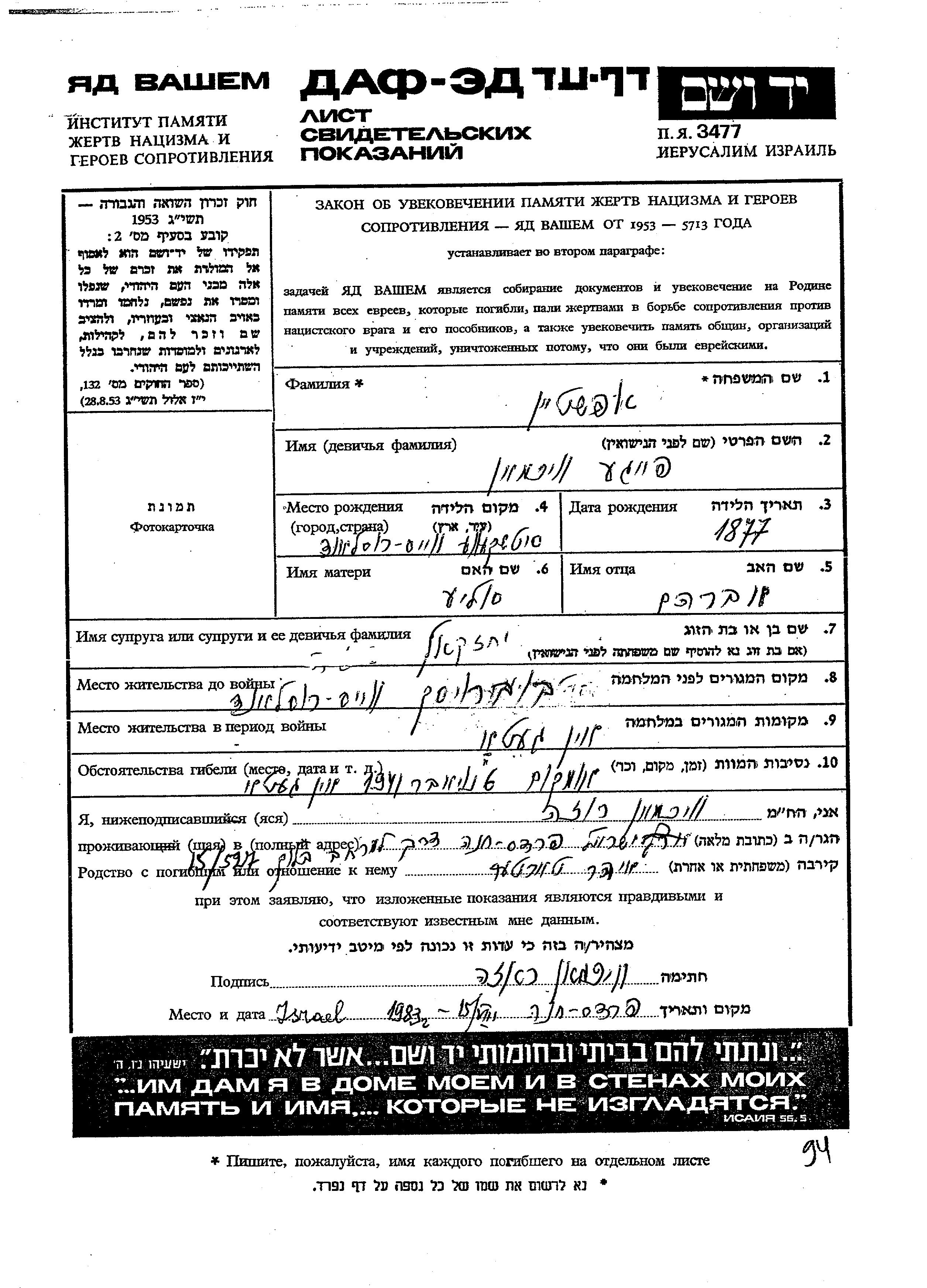 Яд Вашем - Листы свидетельских показаний Мемориального фонда
