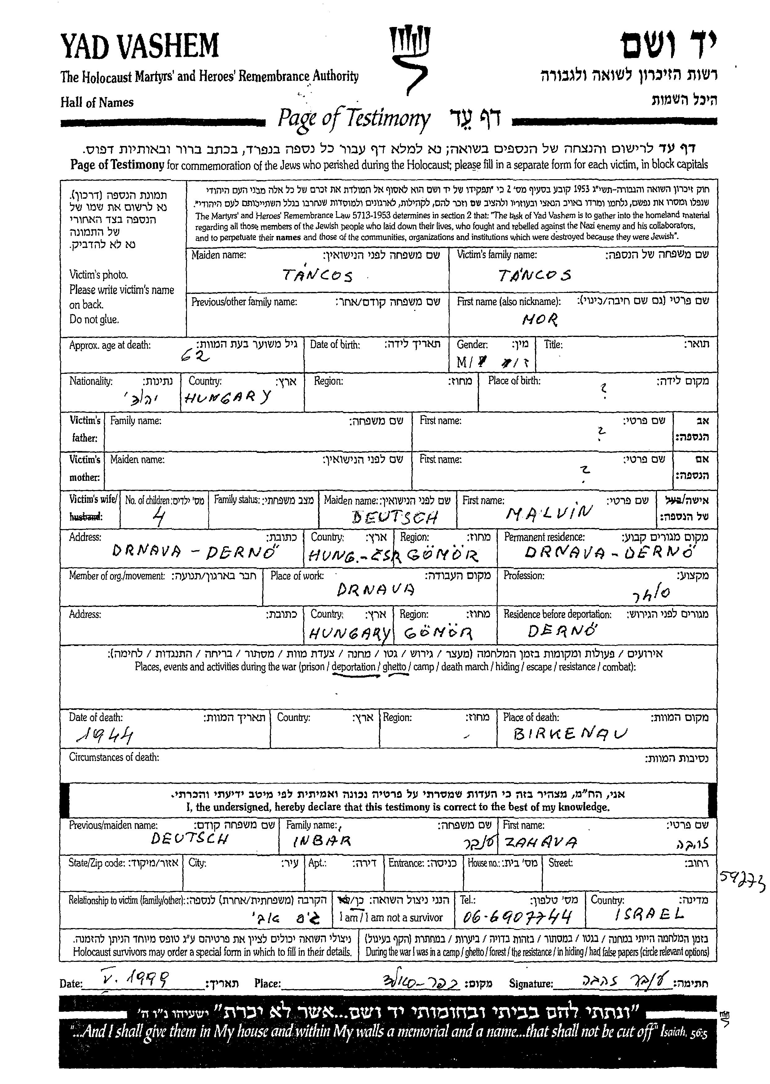 Мор Танцош. Торговец / торговка. Место жительства до войны: Дрнава, Чехословакия. Место во время войны: Дрнава, Чехословакия.