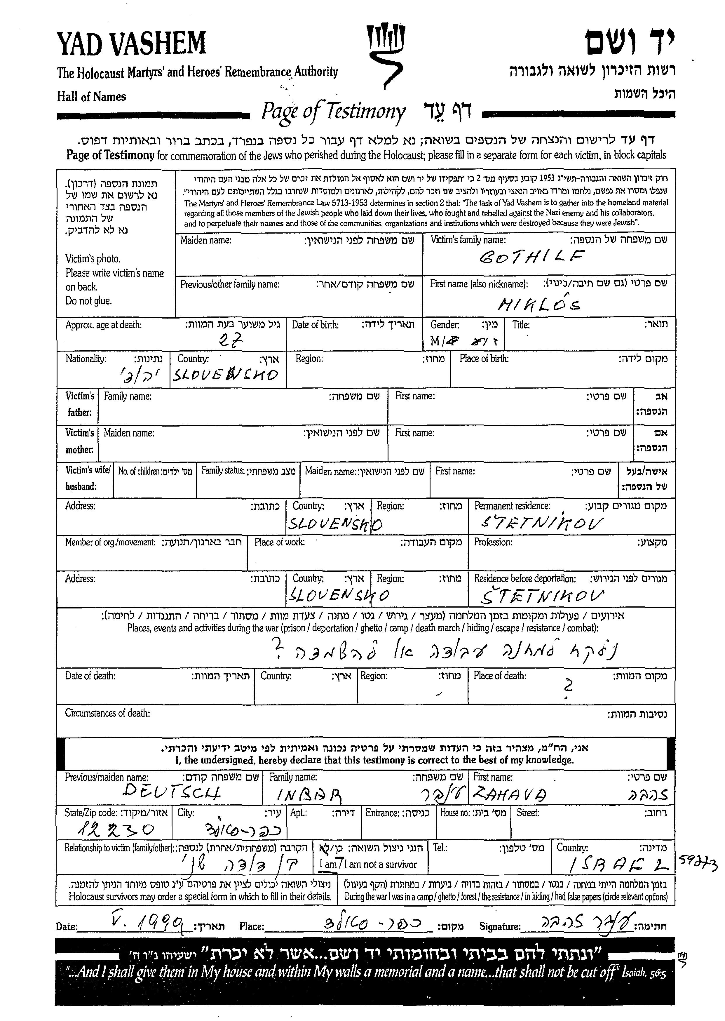 Миклош Готхильф, место рождения: Словакия, Чехословакия. Место жительства до войны: Stetnikov, Чехословакия. Место во время войны: Stetnikov, Чехословакия.