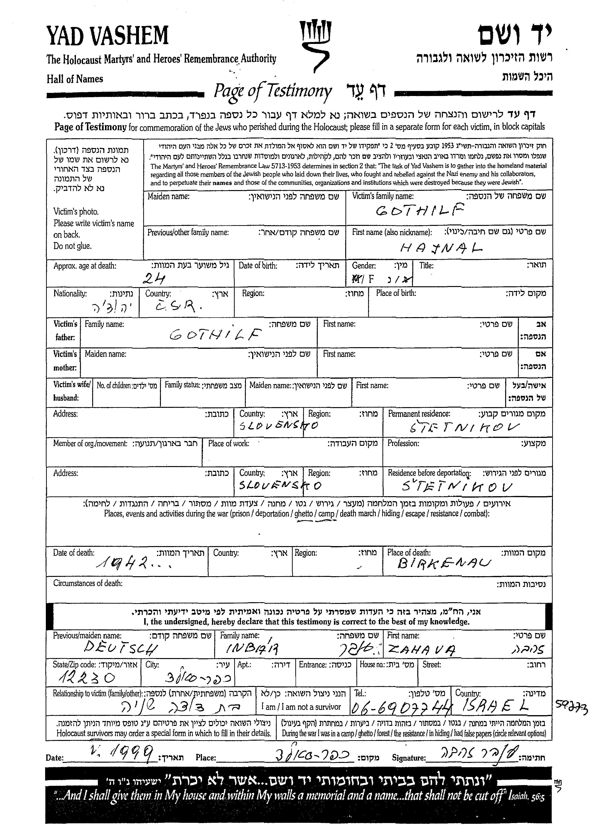 Хайналь Готхильф, место рождения: Чехословакия. Место жительства до войны: Stetnikov, Чехословакия. Место во время войны: Stetnikov, Чехословакия.