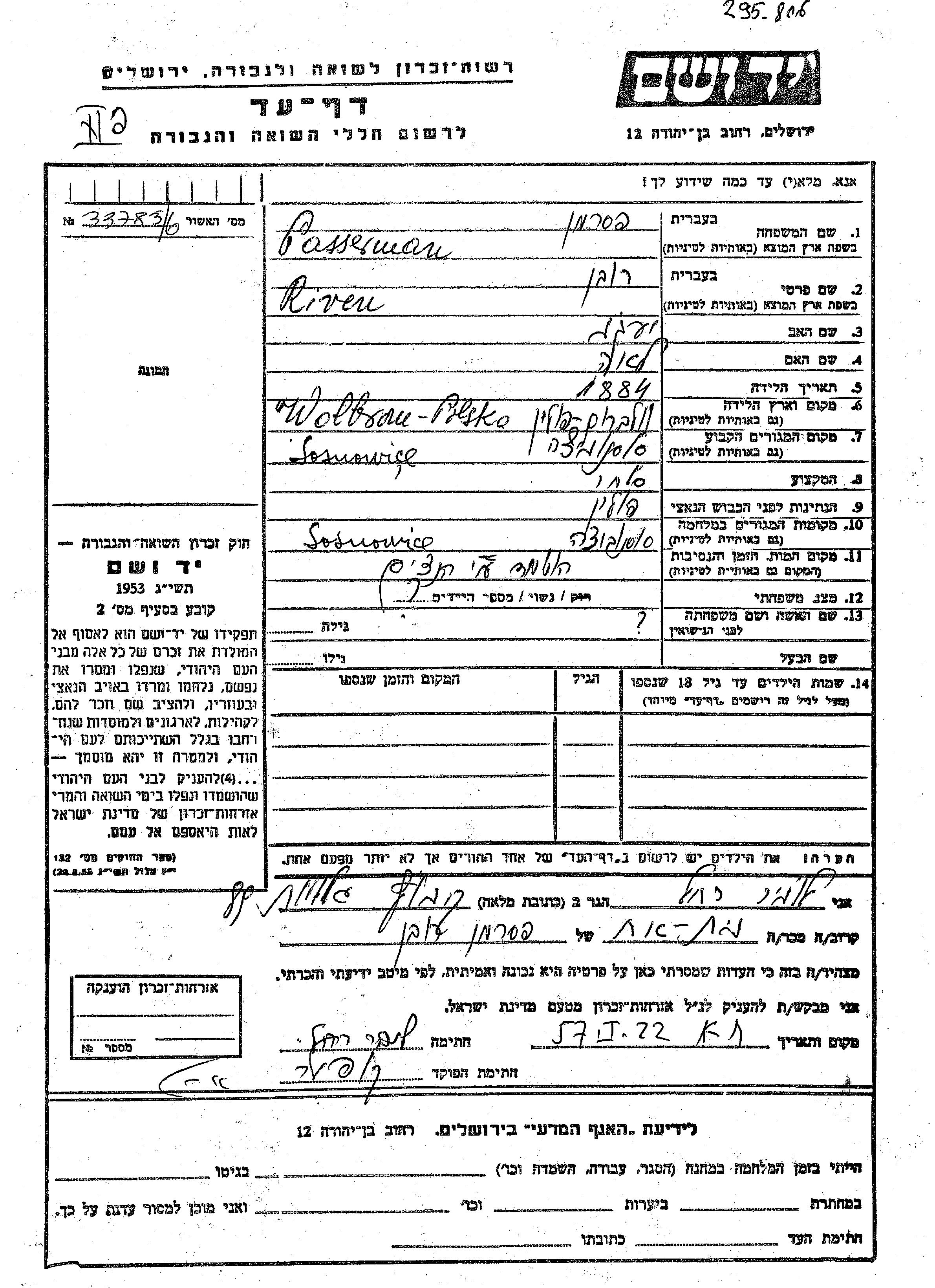 Ривен Пасерман, место рождения: Вольбром, Польша. Отец: Яков, mать:Лея. Торговец / торговка. Женат / замужем. Место жительства до войны: Сосновец, Польша. Место во время войны: Сосновец, Польша.