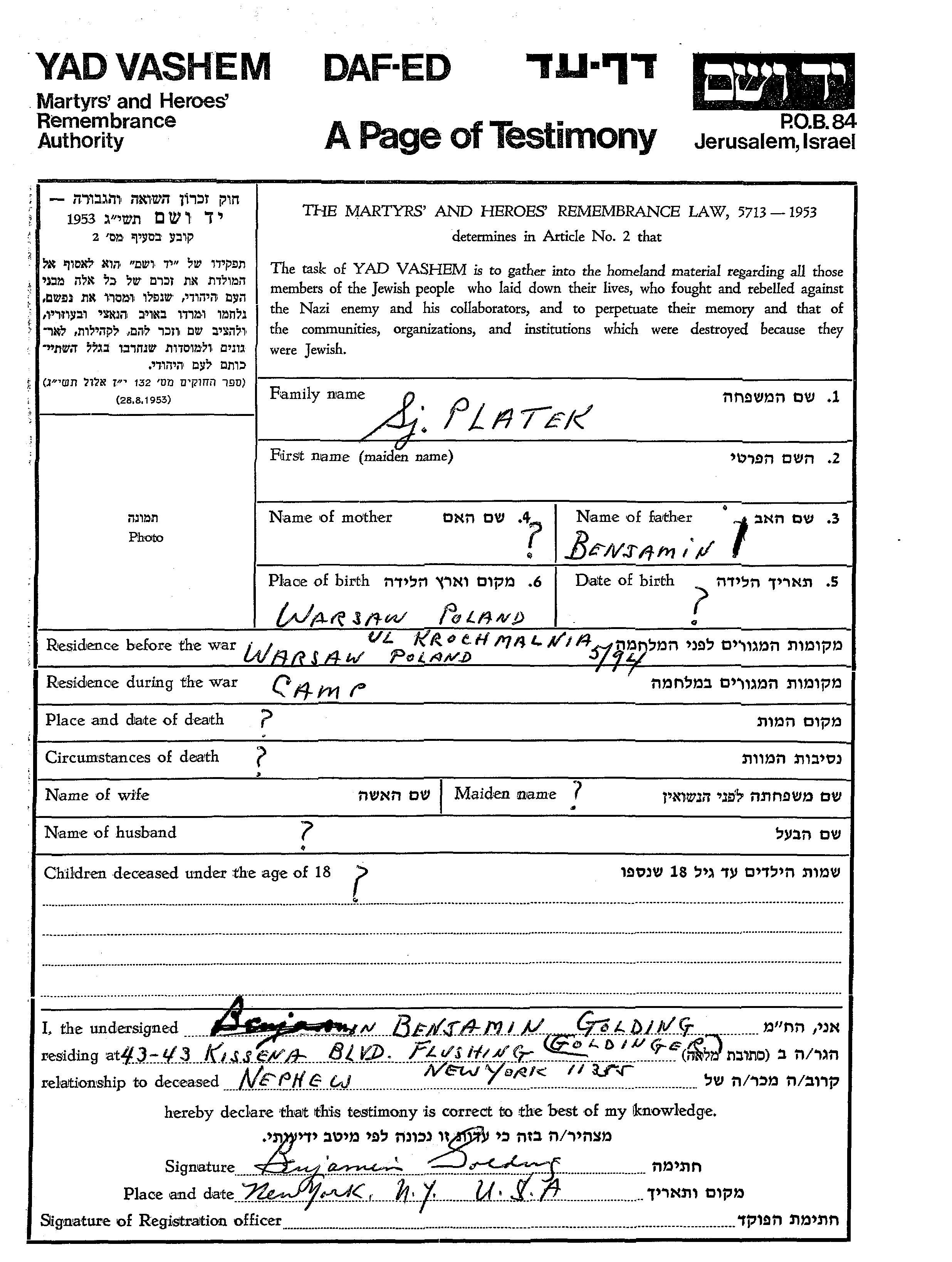 Имя неизвестно Платек, место рождения: Варшава, Польша. Отец: Беньямин. Место жительства до войны: Варшава, Польша. Место во время войны: Варшава, Польша.