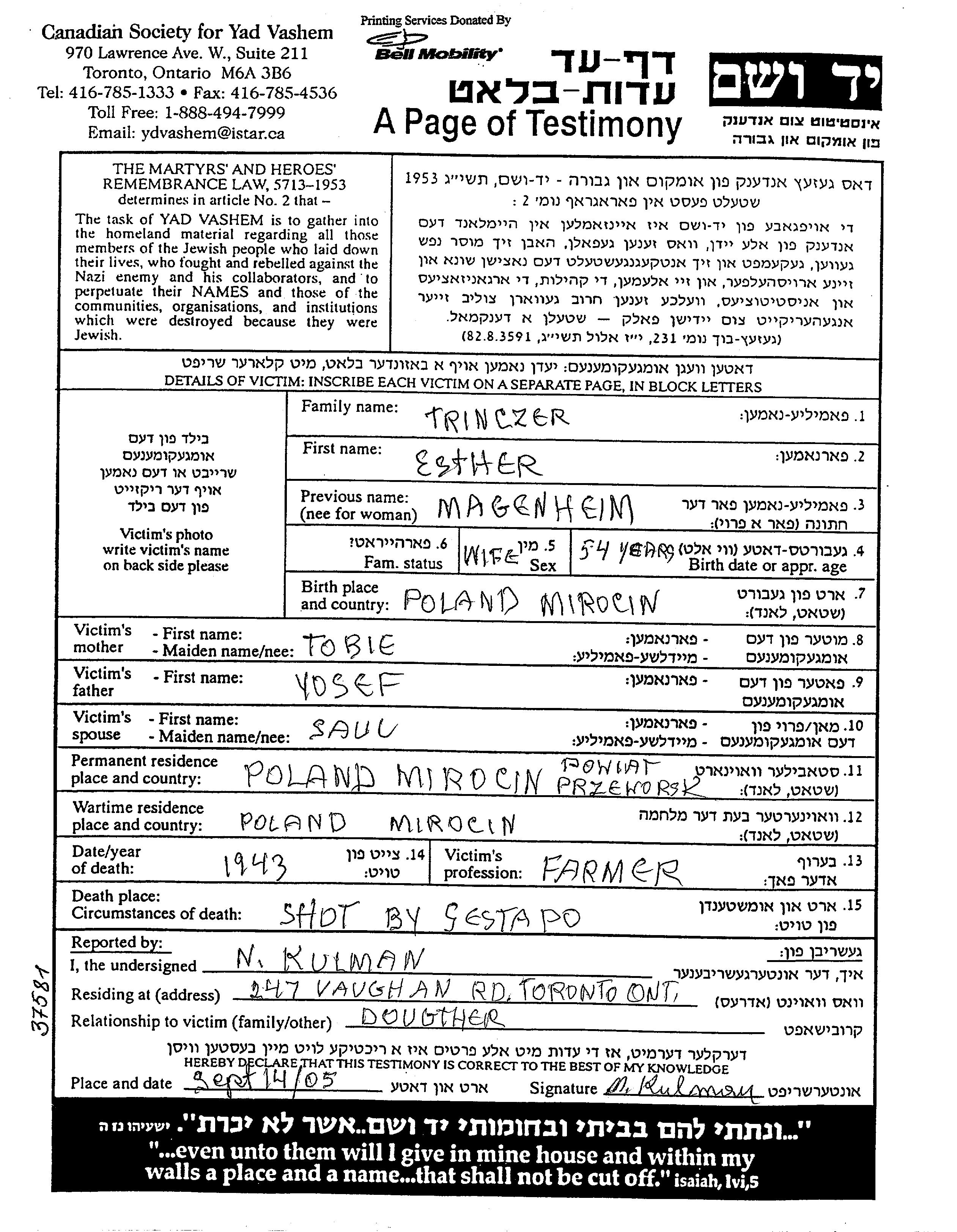 Тринчер Эстер Mirocin, Польша Лист свидетельских показаний