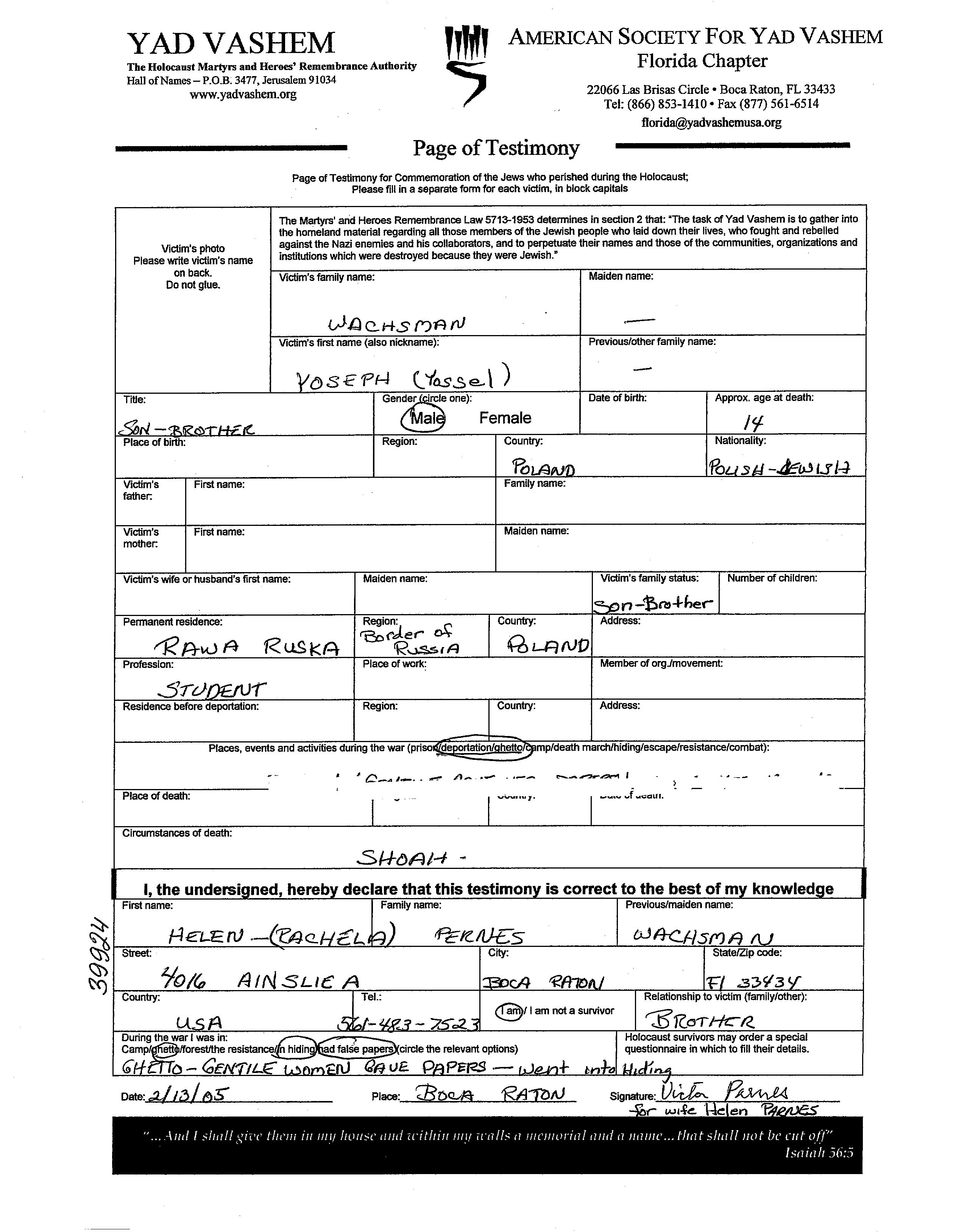 Вахсман Иосеф Рава-Русская, Польша Лист свидетельских показаний