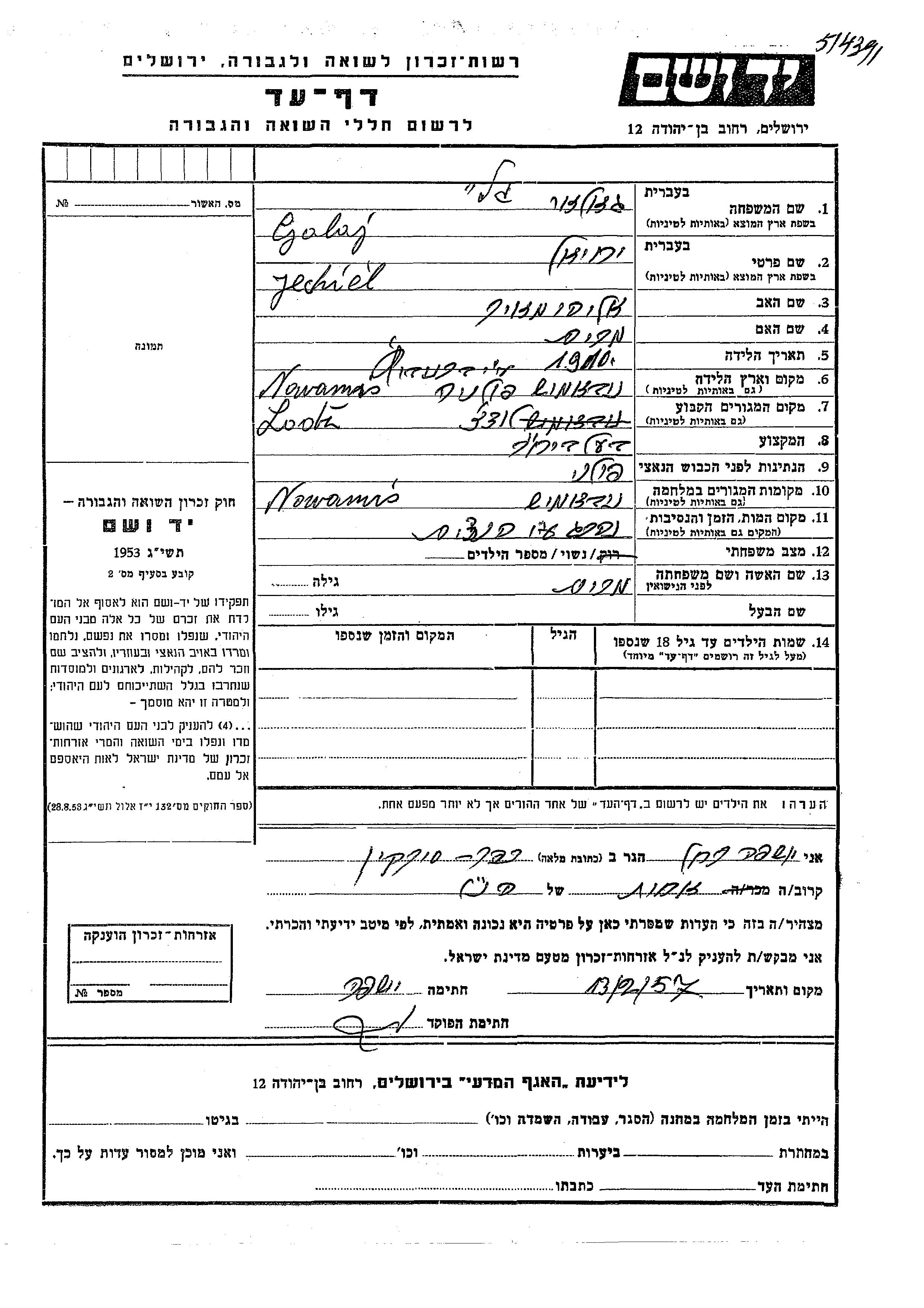 Иехиэль Галай, место рождения: Нове-Място, Польша. Отец: Элиягу Меир, mать:Мирьям. Фабрикант. Женат / замужем. Место жительства до войны: Лодзь, Польша. Место во время войны: Нове-Място, Польша.