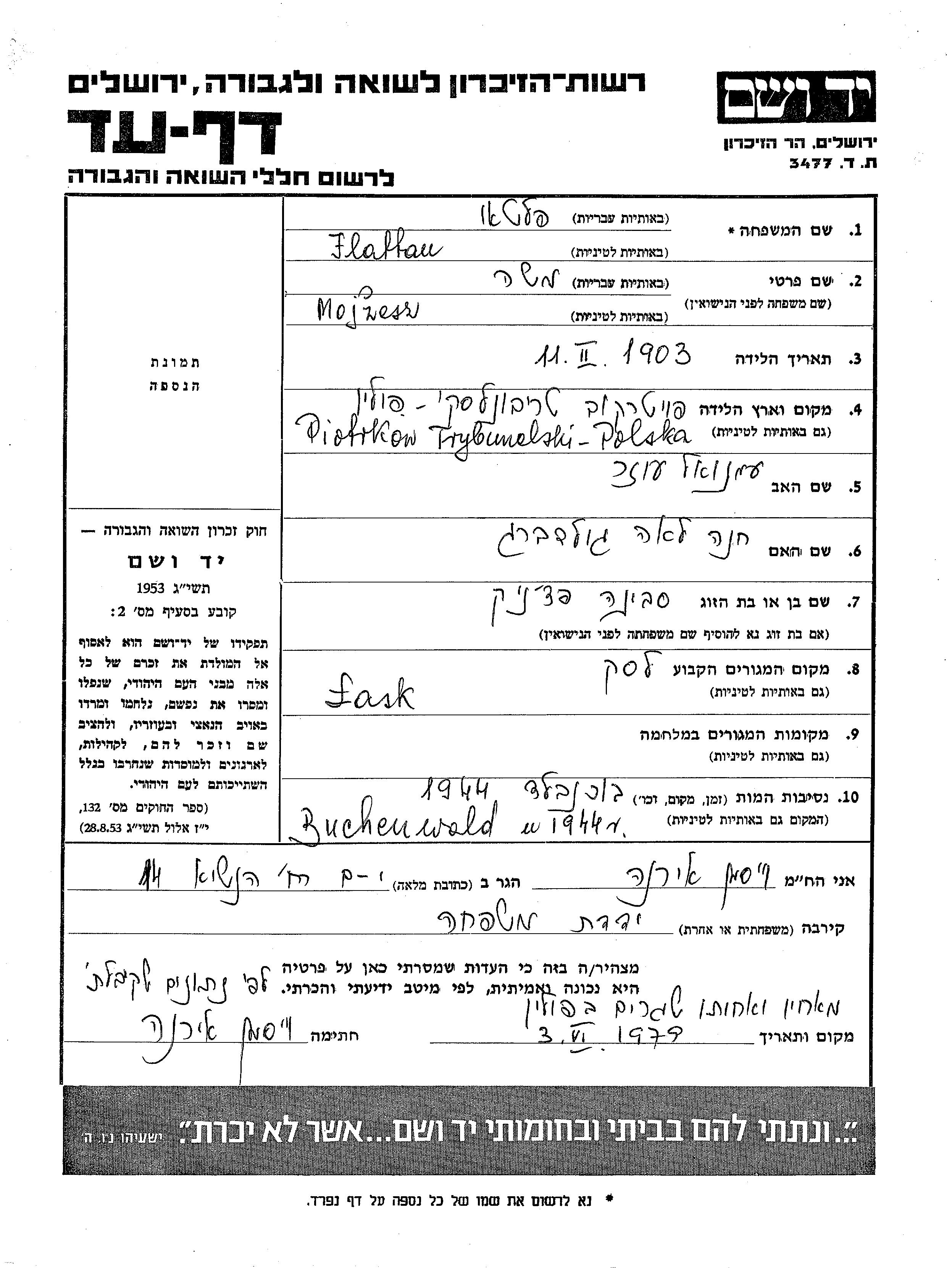 Мойжеш Флаттау, место рождения: Пётркув, Польша. Отец: Эмануэль Озер, mать:Хана Лея. Женат / замужем. Место жительства до войны: Ласк, Польша.