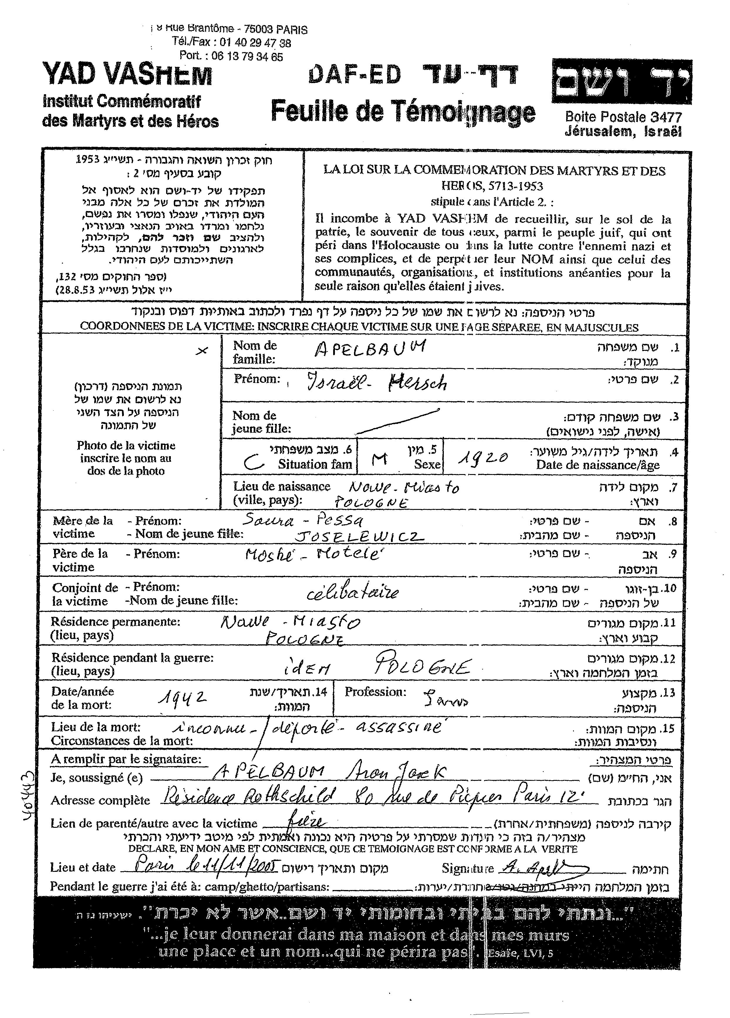 Герш Исраэль Апельбаум, место рождения: Нове-Място, Польша. Отец: Моше Мотеле, mать:Саура Песса, девичья фамилия Йоселевич. Холост / не замужем. Место жительства до войны: Нове-Място, Польша. Место во время войны: Нове-Място, Польша.