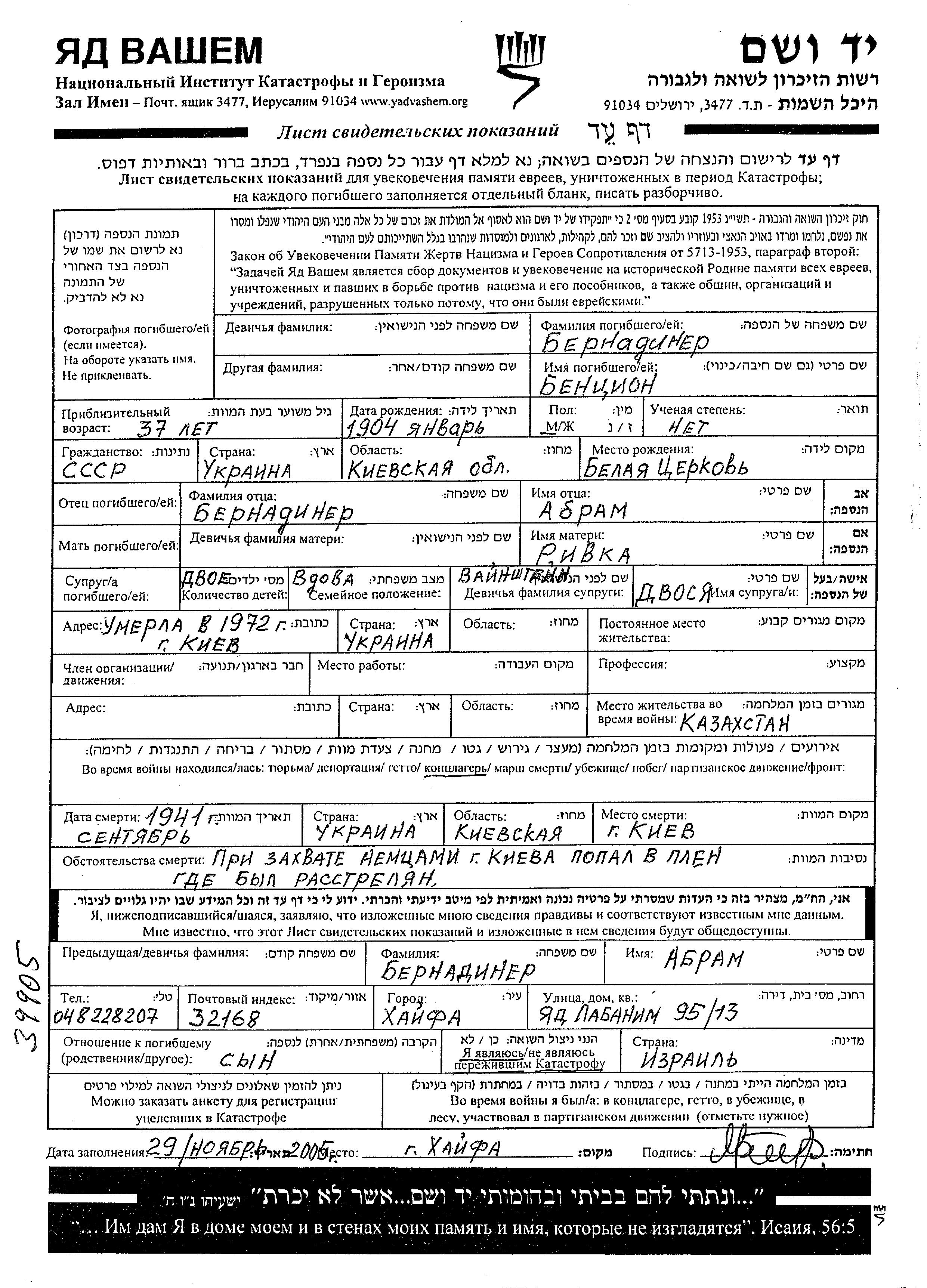 Бернадинер Бенцион 1904 Киев, Украина (СССР) Лист свидетельских показаний