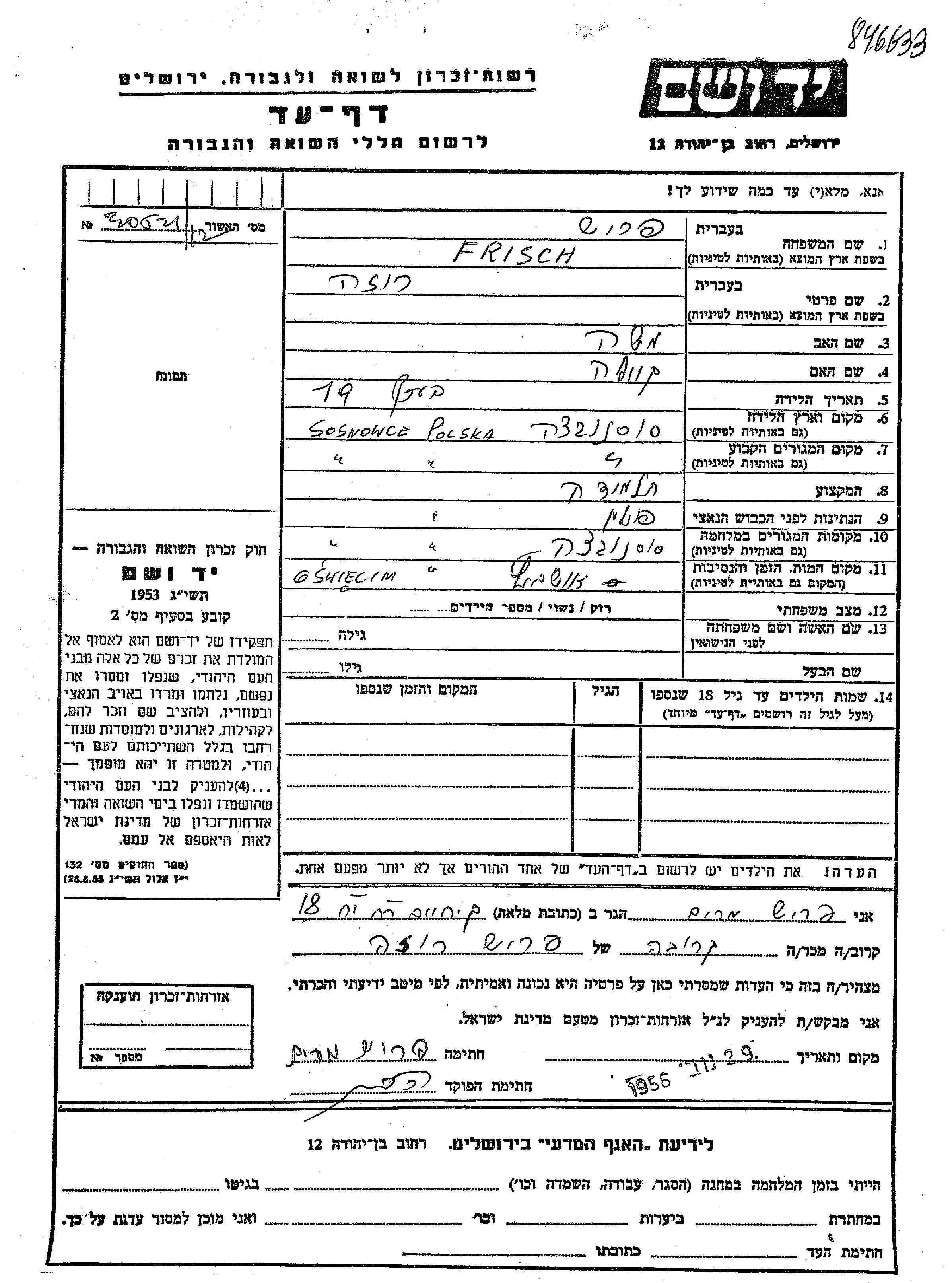 Роза Фриш, место рождения: Сосновце, Польша. Отец: Моше, mать:Кейла. Ученик / ученица. Место жительства до войны: Сосновце, Польша. Место во время войны: Сосновце, Польша.