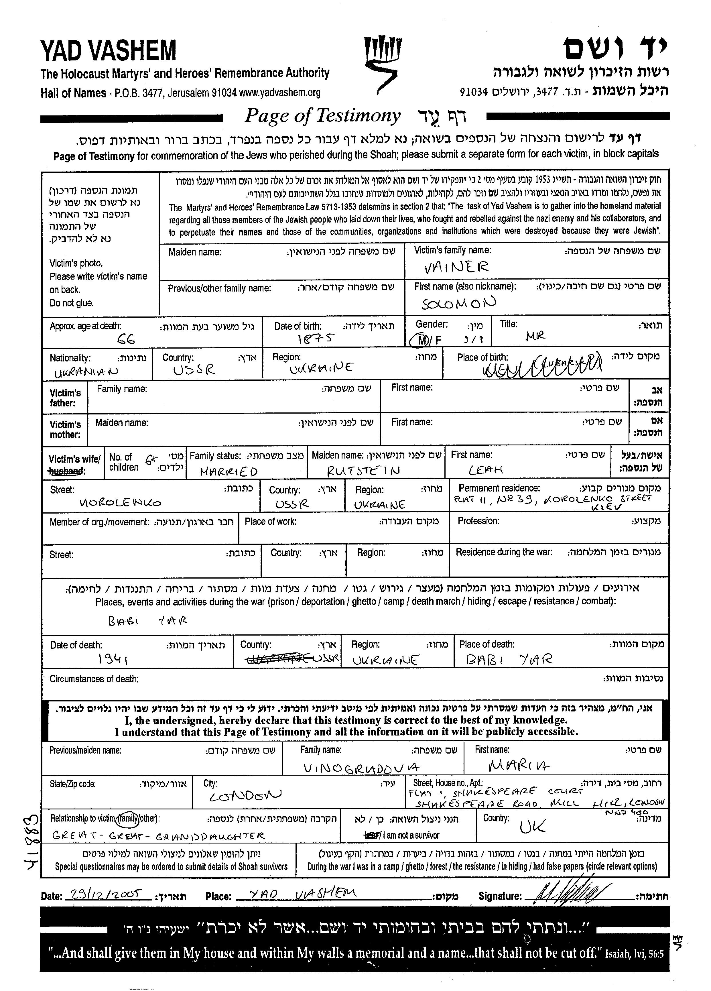 Вайнер Соломон 1875 Киев, Украина (СССР) Лист свидетельских показаний