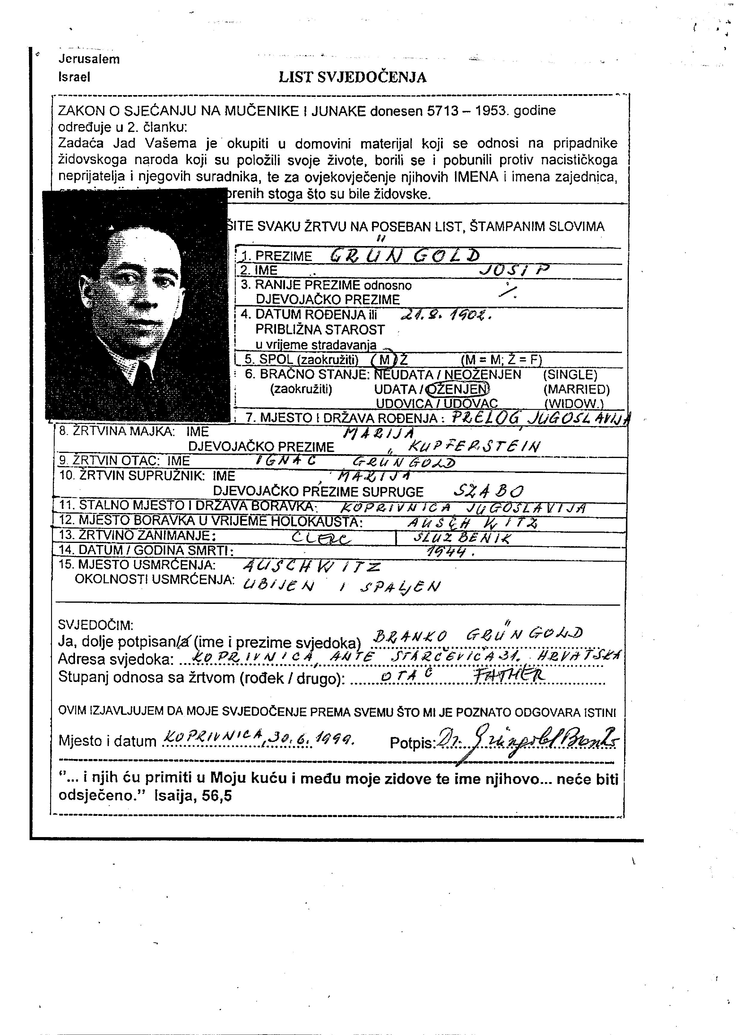 Йосип Грюнгольд, место рождения: Прелог, Югославия. Отец: Игнац, mать:Мария, девичья фамилия Купферштайн. Клерк. Женат / замужем. Место жительства до войны: Копривница, Югославия. Место во время войны: Аушвиц, Польша.