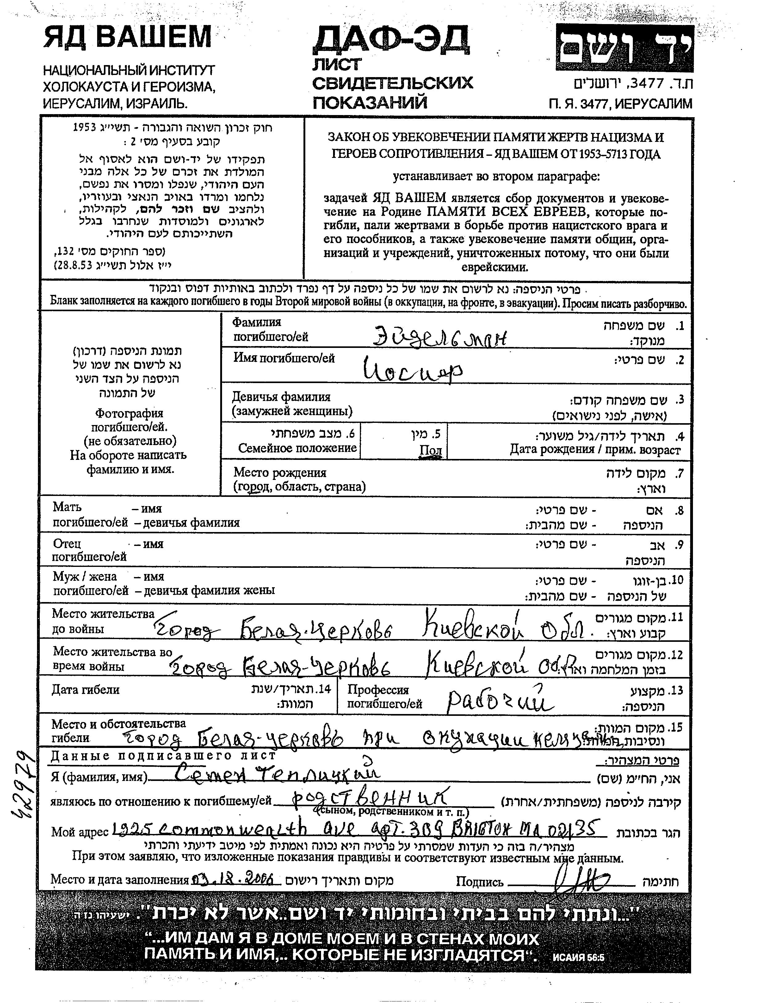 Эйдельман Иосиф Белая Церковь, Украина (СССР) Лист свидетельских показаний