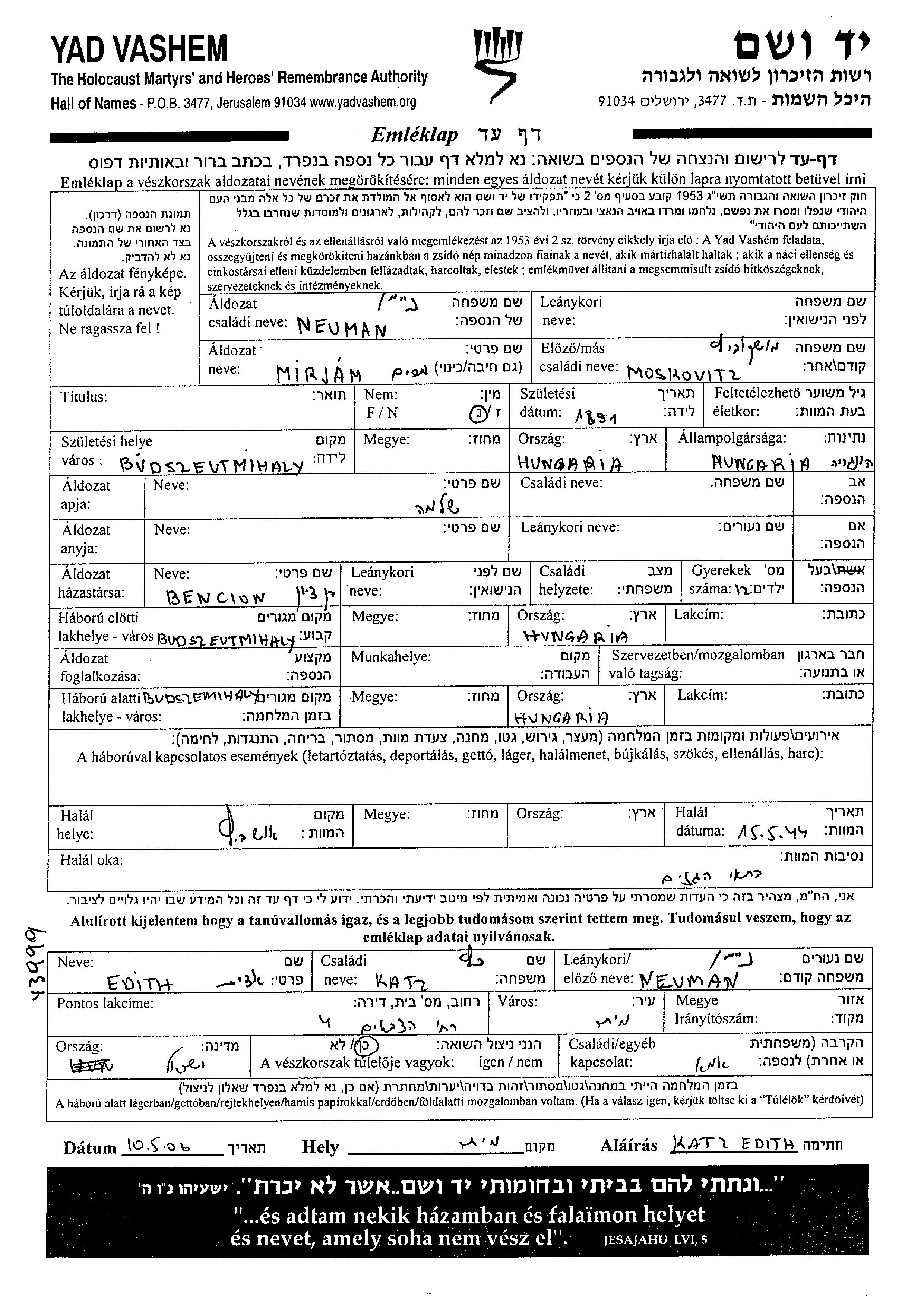 Мирьям Нейман, девичья фамилия Московиц, место рождения: Будсентмихай, Венгрия. Отец: Шломо. Женат / замужем. Место жительства до войны: Будсентмихай, Венгрия. Место во время войны: Будсентмихай, Венгрия.