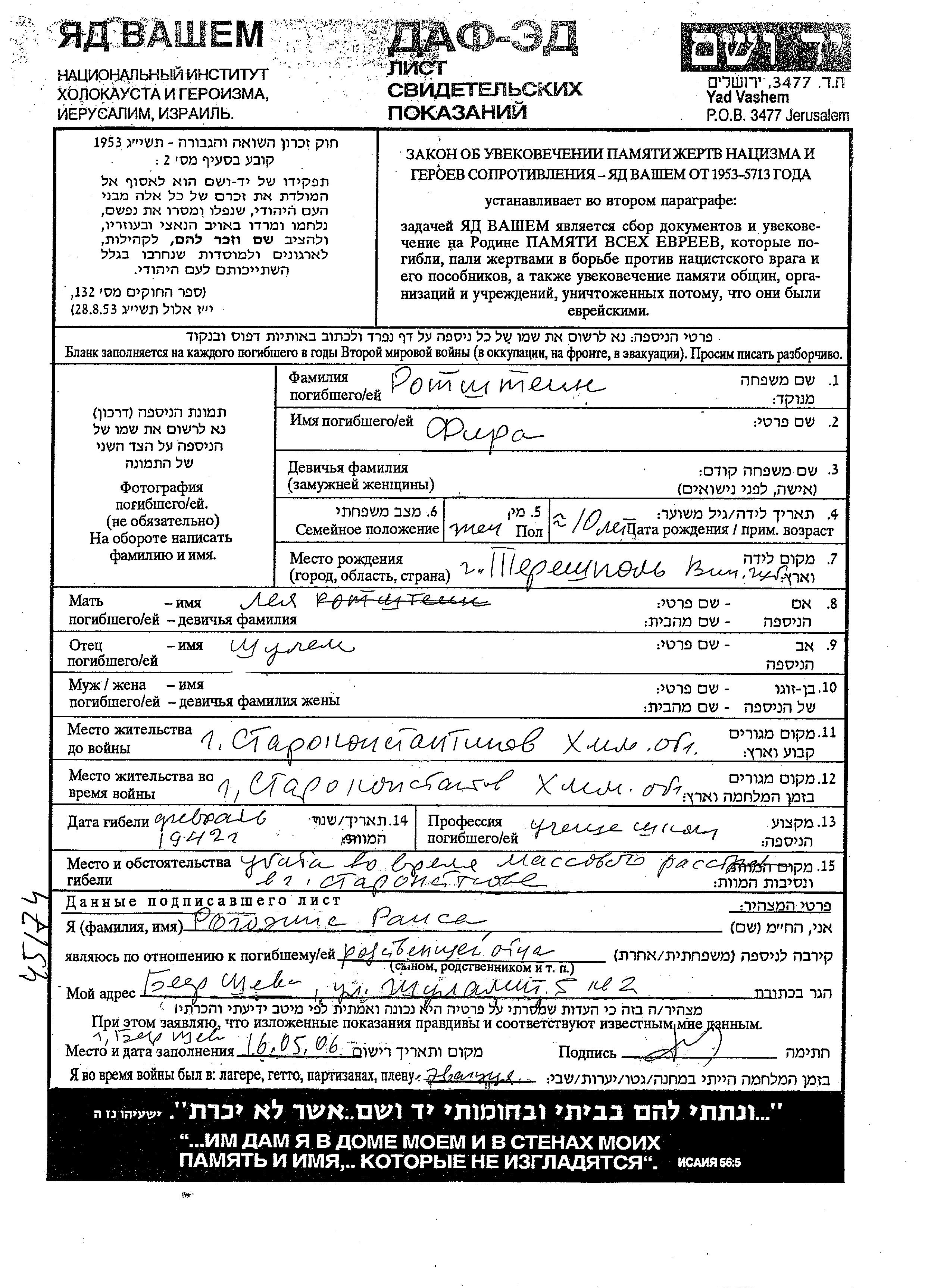Яд Вашем - Листы свидетельских показаний Мемориального фонда