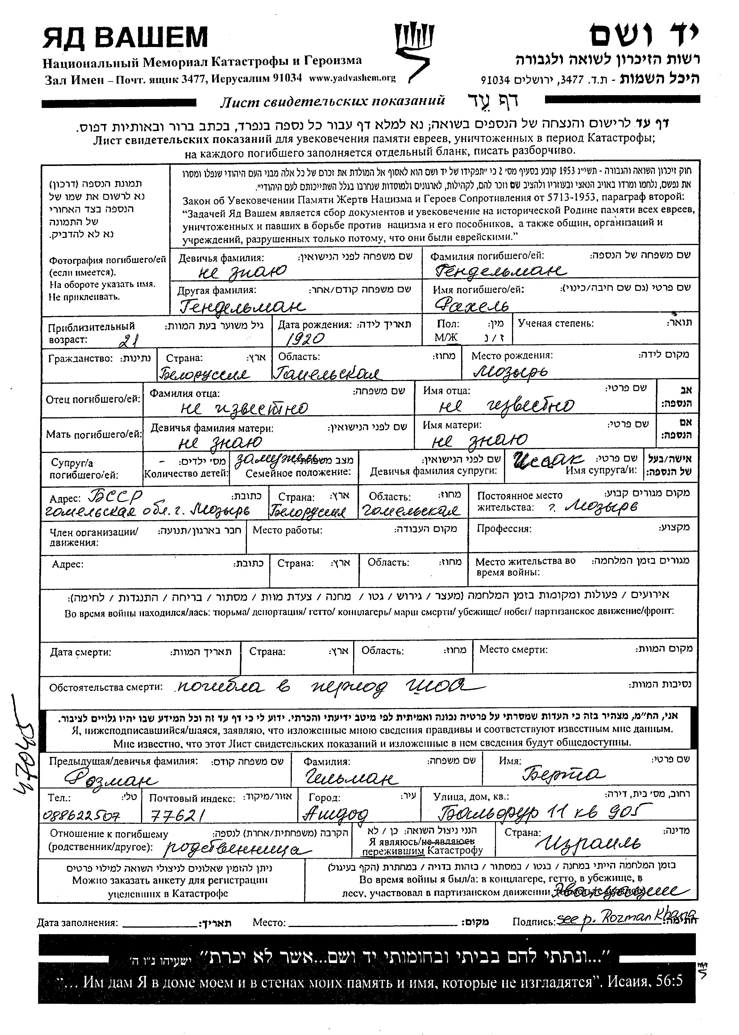 Гендельман Рахель 1920 Мозырь, Белоруссия (СССР) Лист свидетельских показаний