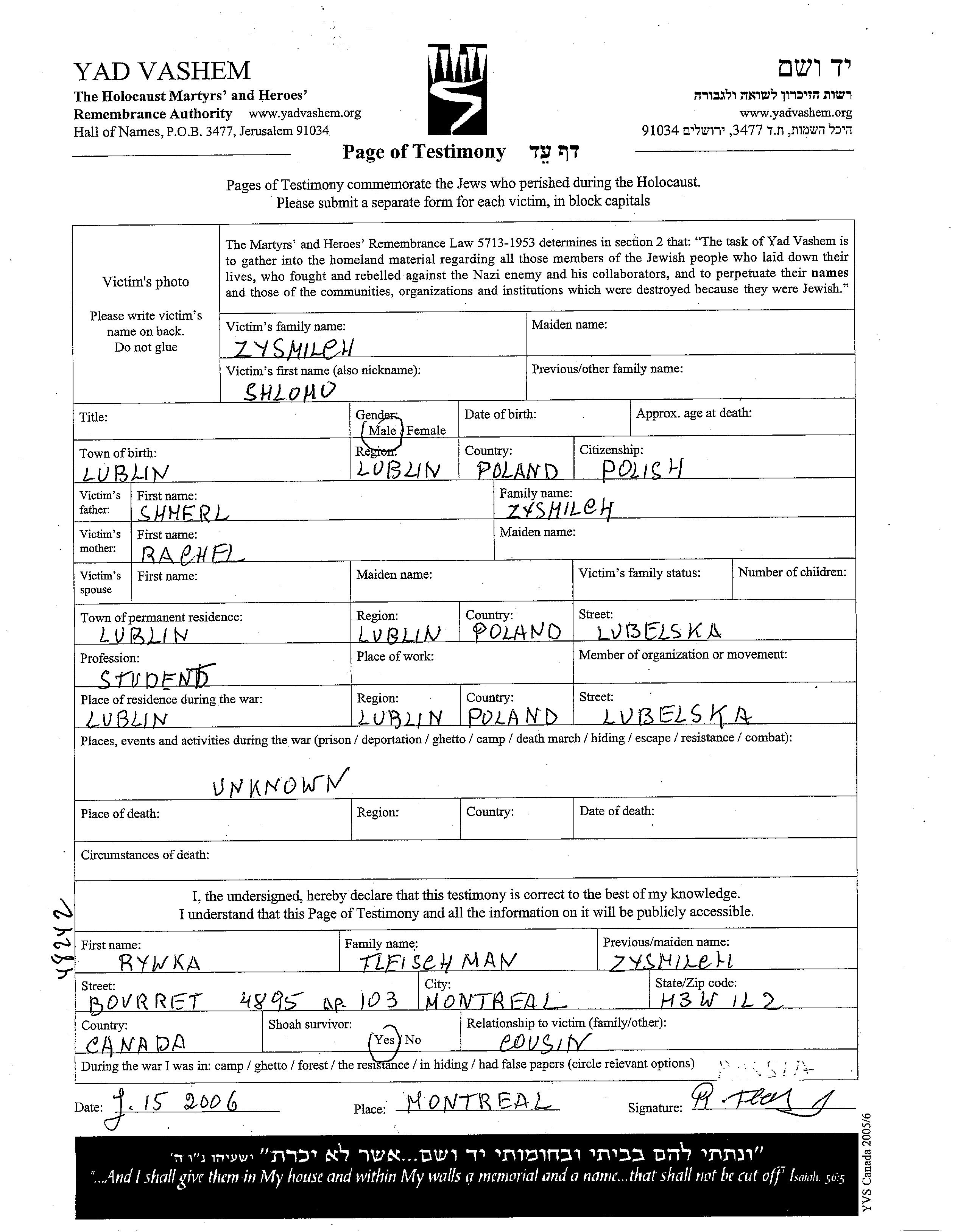 Шломо Зысмильх, место рождения: Люблин, Польша. Отец: Шмерл, mать:Рахель. Студент / студентка. Холост / не замужем. Место жительства до войны: Люблин, Польша. Место во время войны: Люблин, Польша.