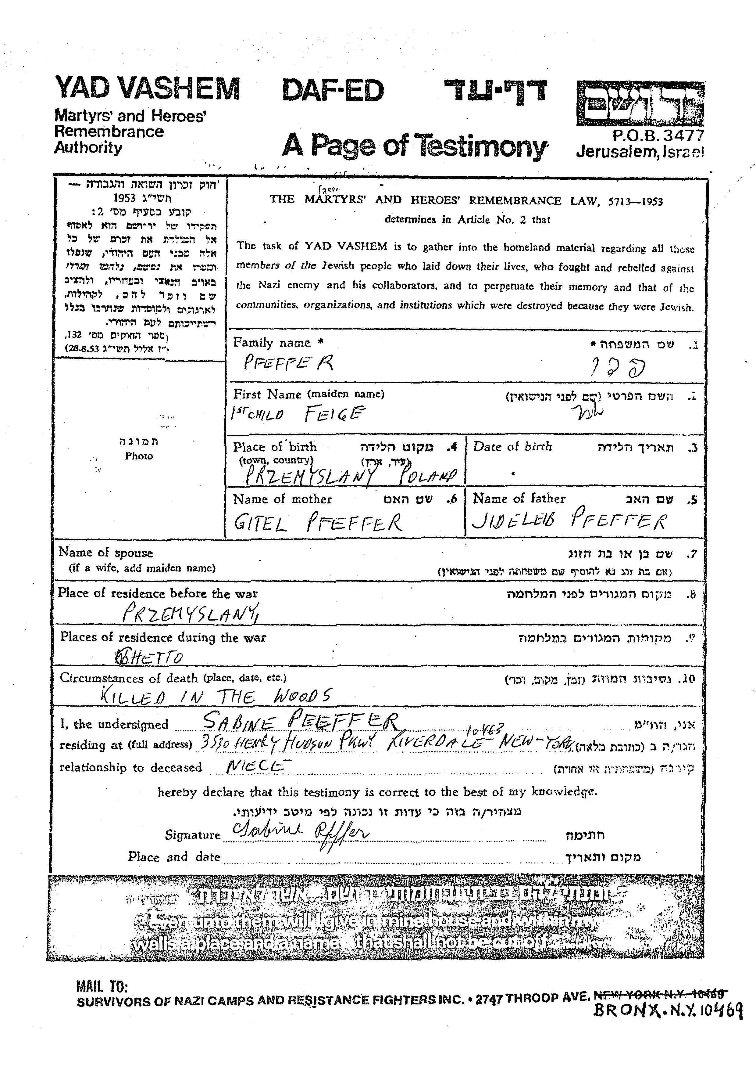 Феффер Фейга Перемышляны, Польша Лист свидетельских показаний