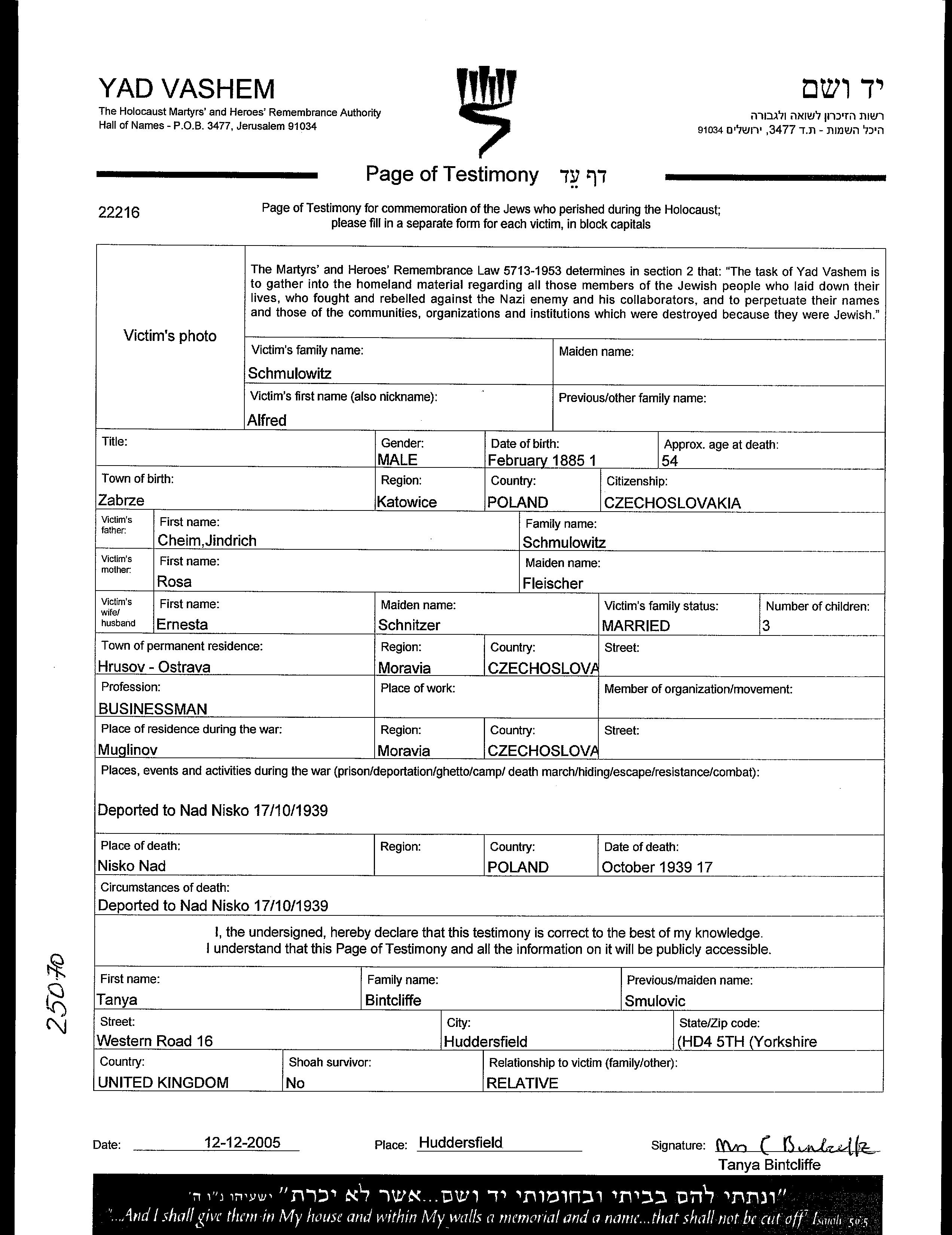 Альфред Шмуловиц, место рождения: Забже, Германия. Отец: Индржих Хейм, mать:Роза, девичья фамилия Флайшер. Предприниматель. Женат / замужем. Место жительства до войны: Грушов, Чехословакия. Место во время войны: Муглинов, Чехословакия. Альфред уничтожен в период Шоа. место смерти: Ниско, Польша в 17/10/1939.