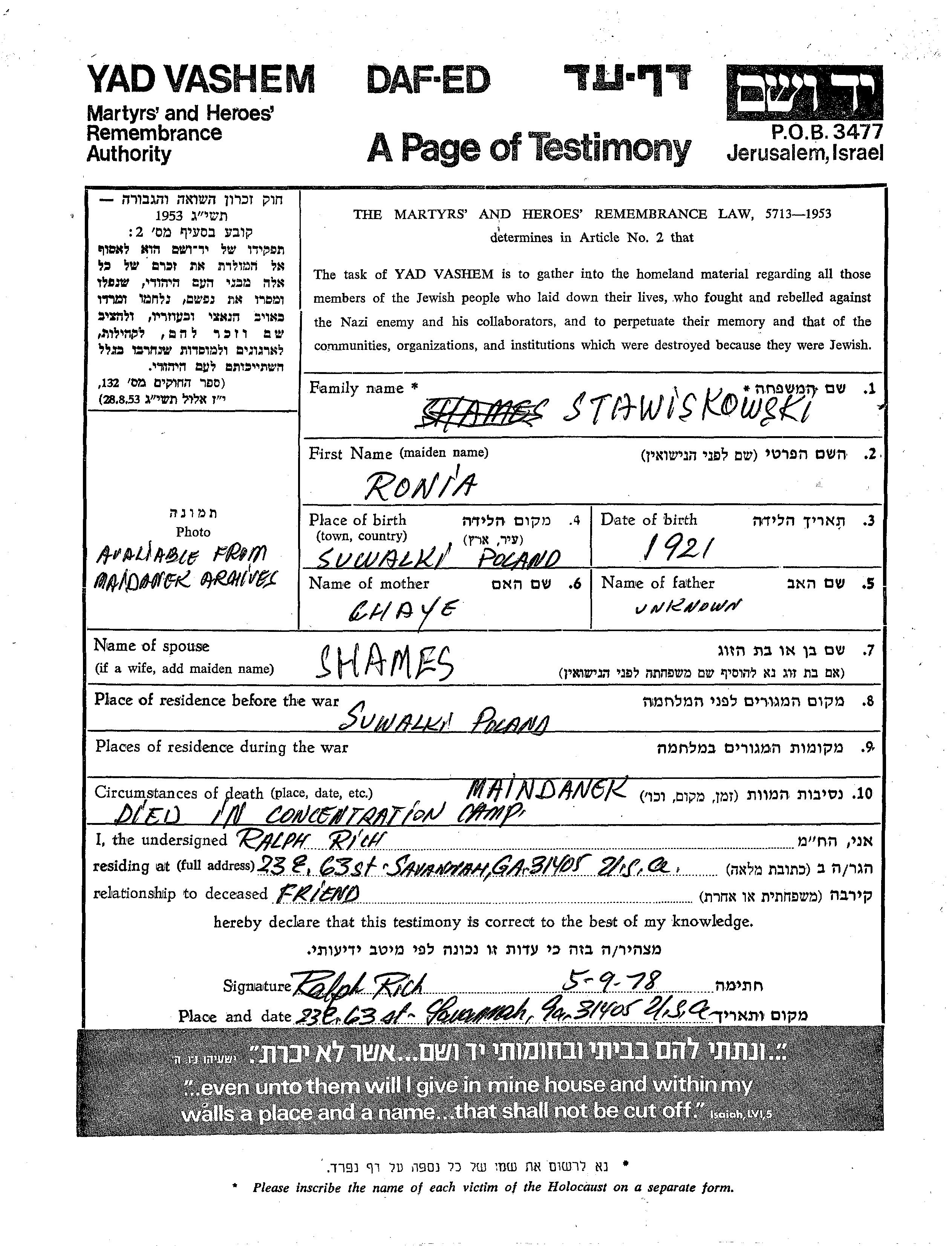 Роня Стависковски, девичья фамилия Шамес, место рождения: Сувалки, Польша.Mать:Хае. Место жительства до войны: Сувалки, Польша. Место во время войны: Майданек, Польша.