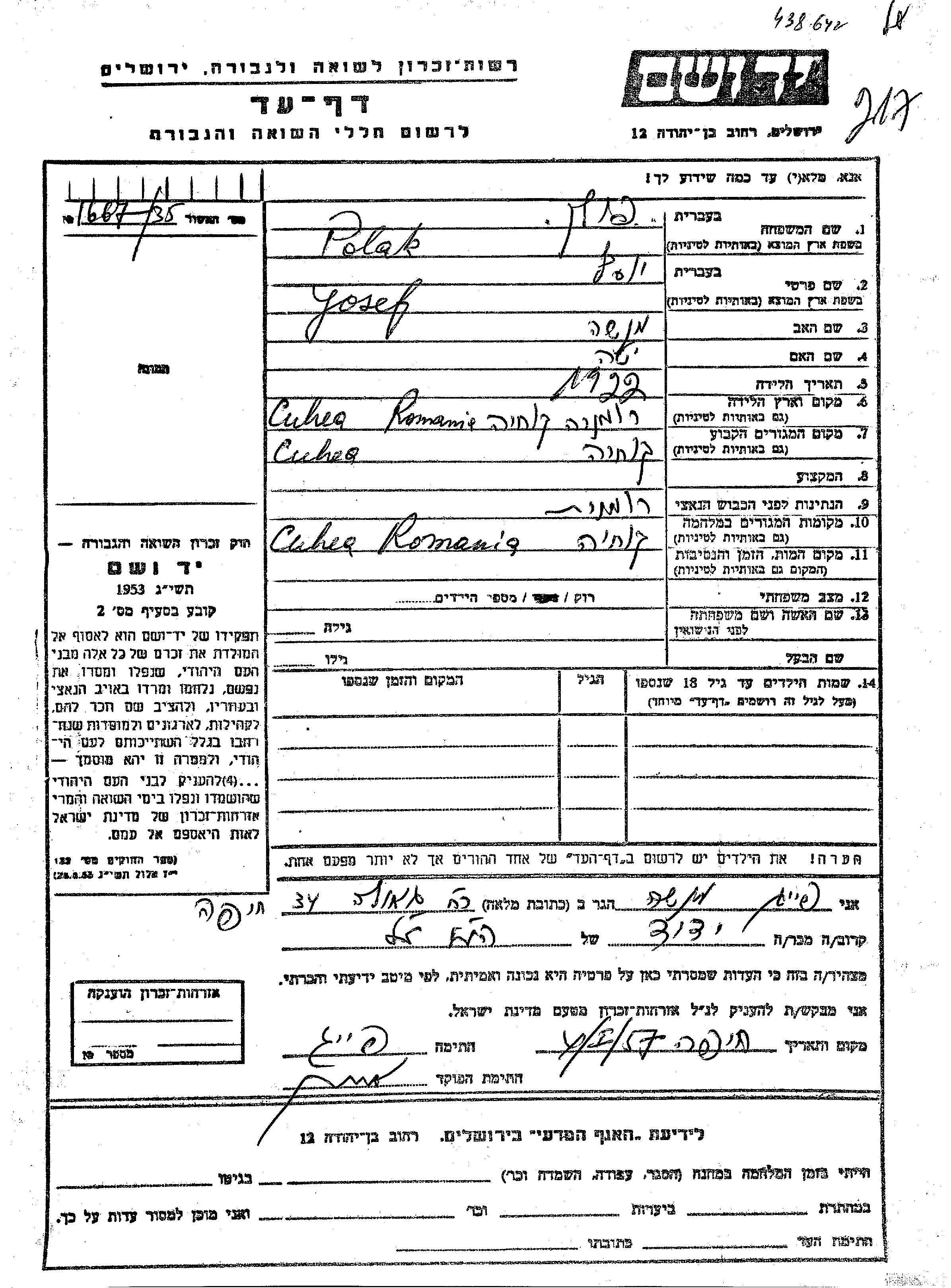 Иосеф Поляк, место рождения: Кухя, Румыния. Отец: Менаше, mать:Ета. Холост / не замужем. Место жительства до войны: Кухя, Румыния. Место во время войны: Кухя, Румыния.