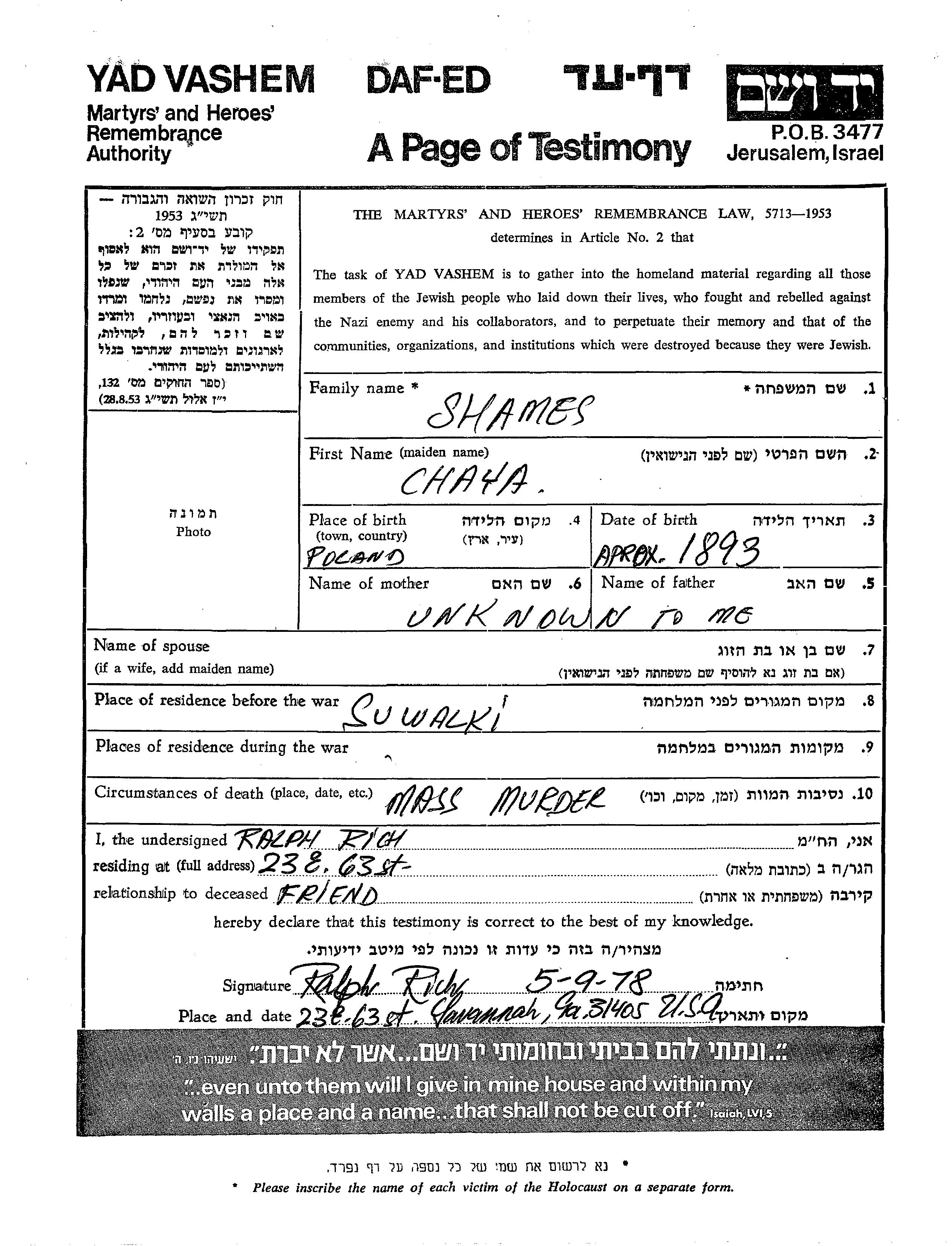 Во время Шоа евреев уничтожали разными способами: газовые камеры, расстрелы, их заживо хоронили или сжигали, непосильным принудительным трудом, голодом, эпидемиями, отсутствием минимальных гигиенических условий и медицинского обслуживания, и т.д. Некоторые евреи добровольно расстались со своей жизнью, чтобы избежать ареста и дальнейших преследований или чтобы покончить с безысходностью и бесконечными страданиями. Десятки тысяч еврейских солдат, служивших в Советской армии и попавших в плен, , были отобраны как евреи и убиты. Многие были зарегистрированы как «пропавшие без вести».