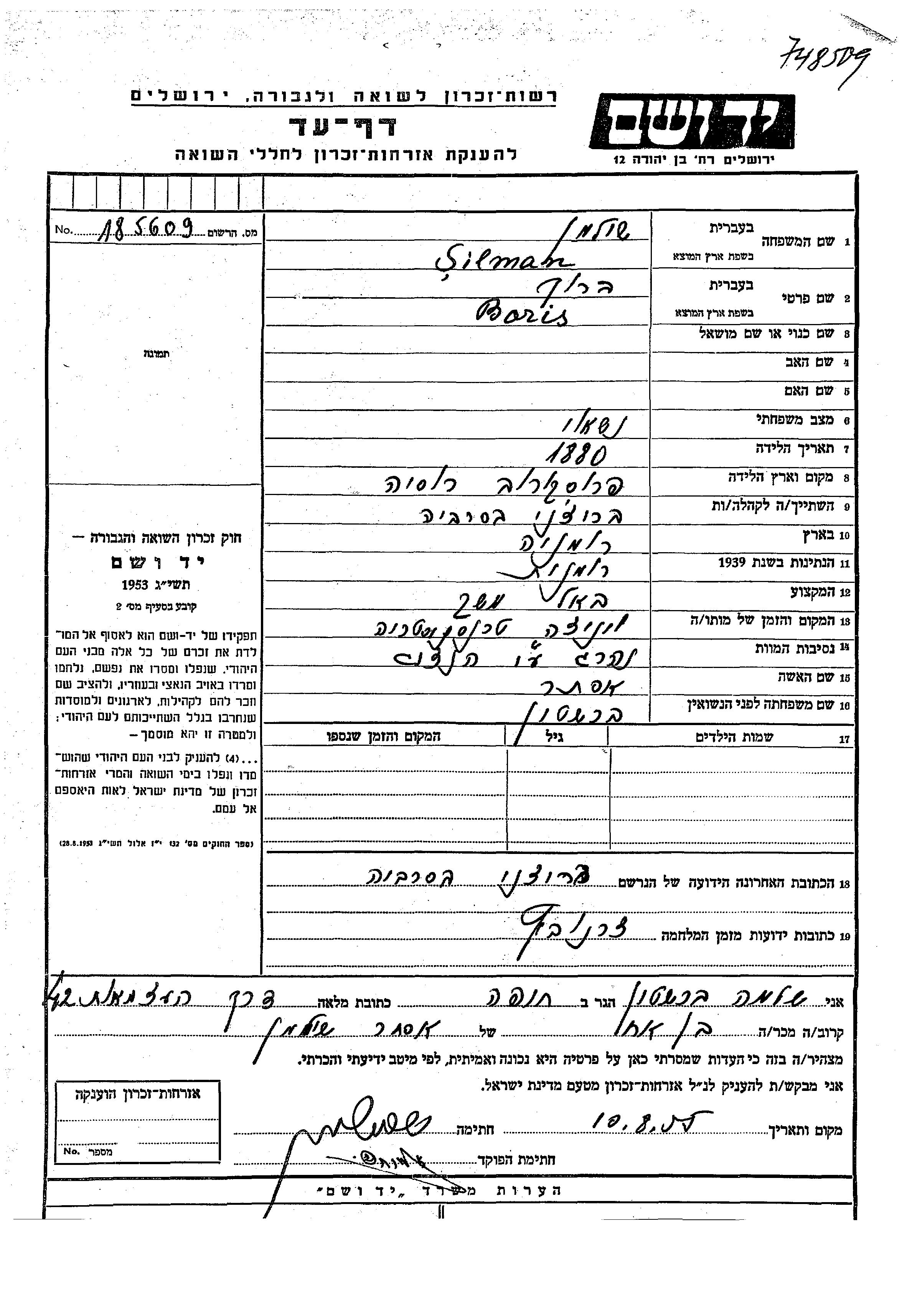 Барух Сильман, место рождения: Проскуров, Украина (СССР). Женат / замужем. Место жительства до войны: Румыния. Место во время войны: Румыния.