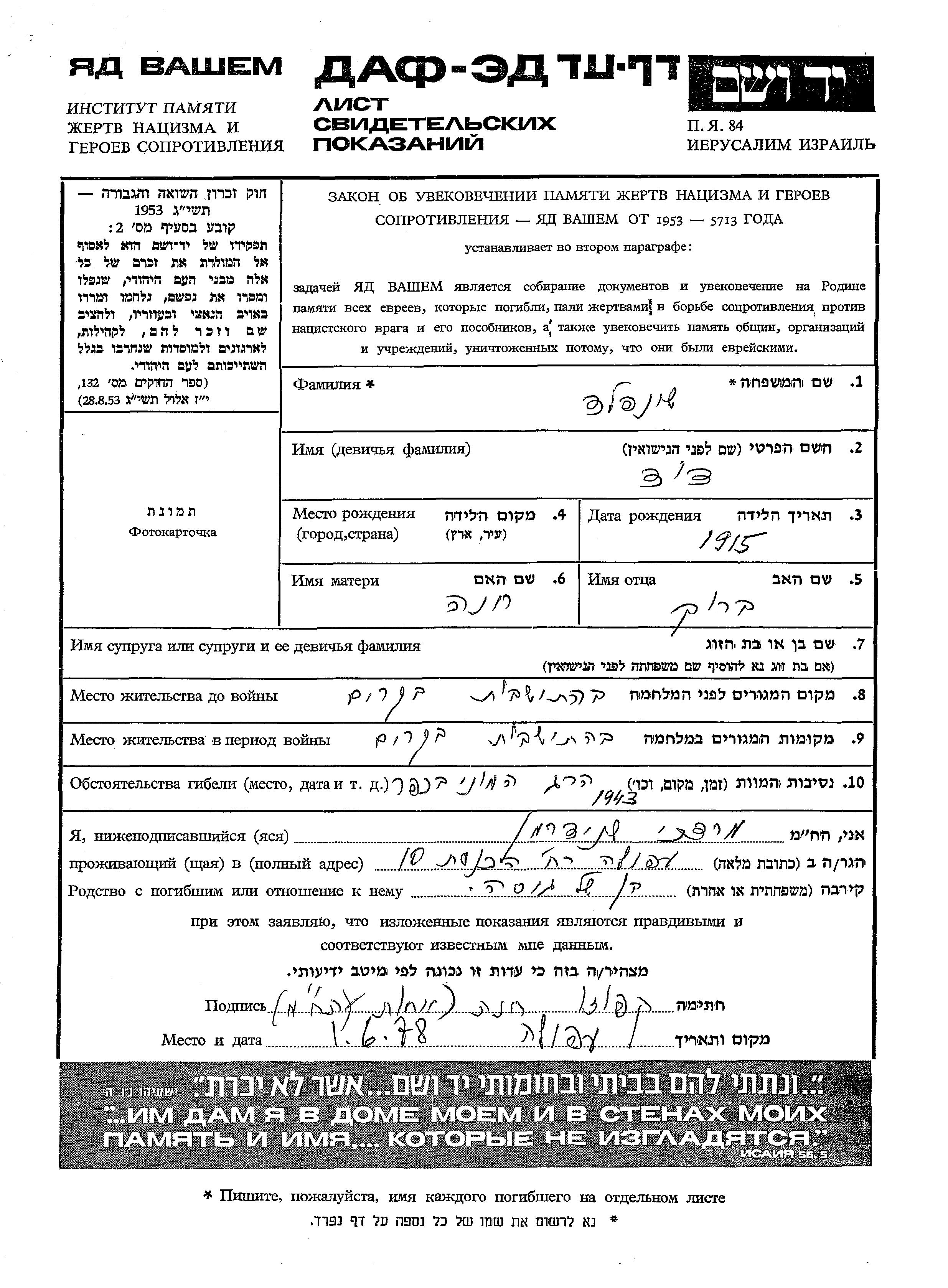 Шейнфельд Давид 1915 место не указано, Лист свидетельских показаний