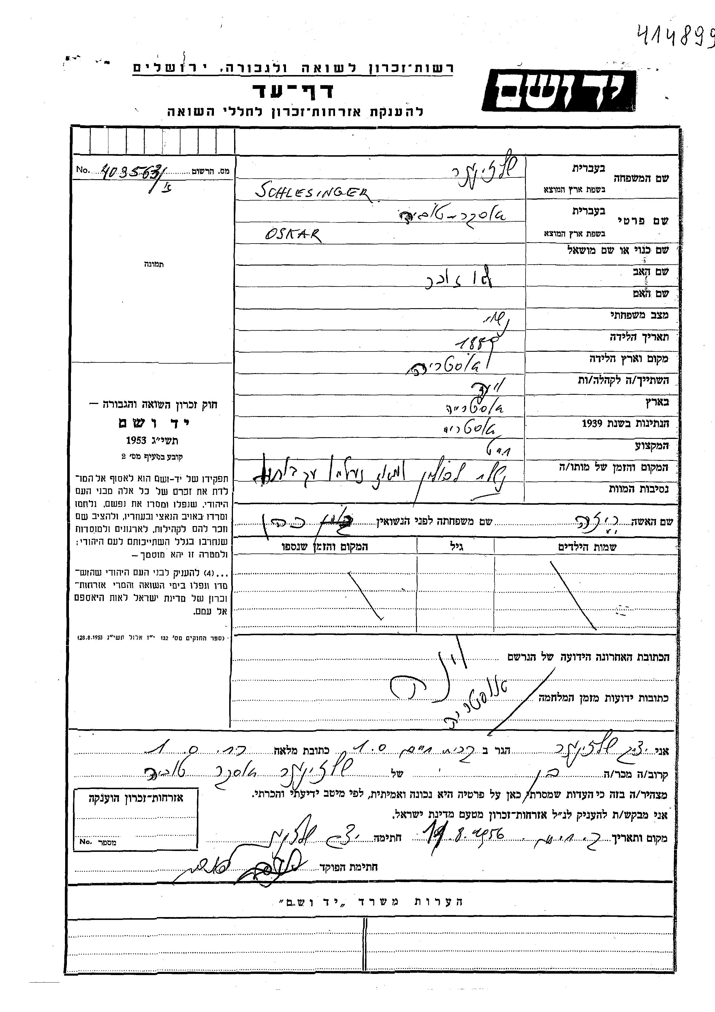 Шлезингер Оскар Тувия 1889 Вена, Австрия Лист свидетельских показаний