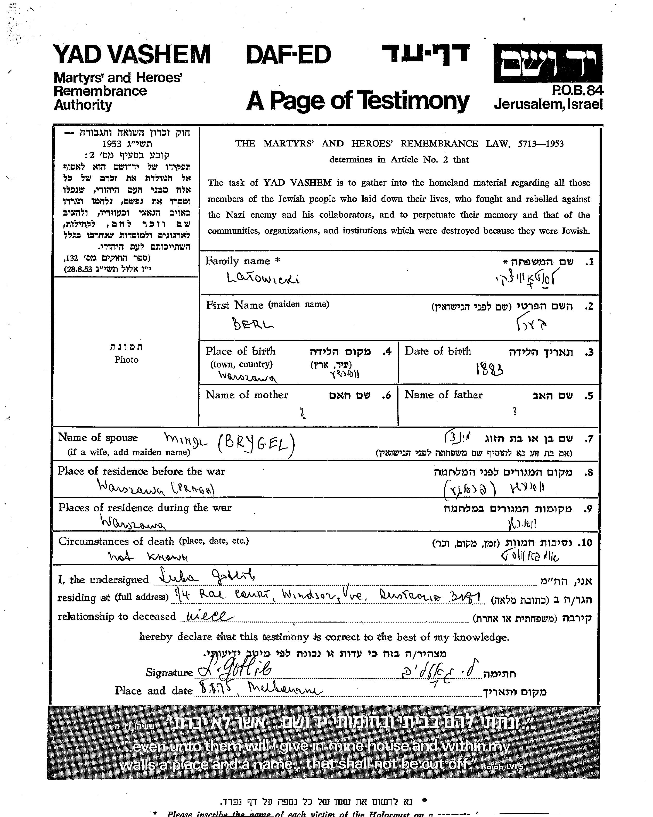 Берл Латовицки, место рождения: Варшава, Польша. Женат / замужем. Место жительства до войны: Варшава, Польша. Место во время войны: Варшава, Польша.