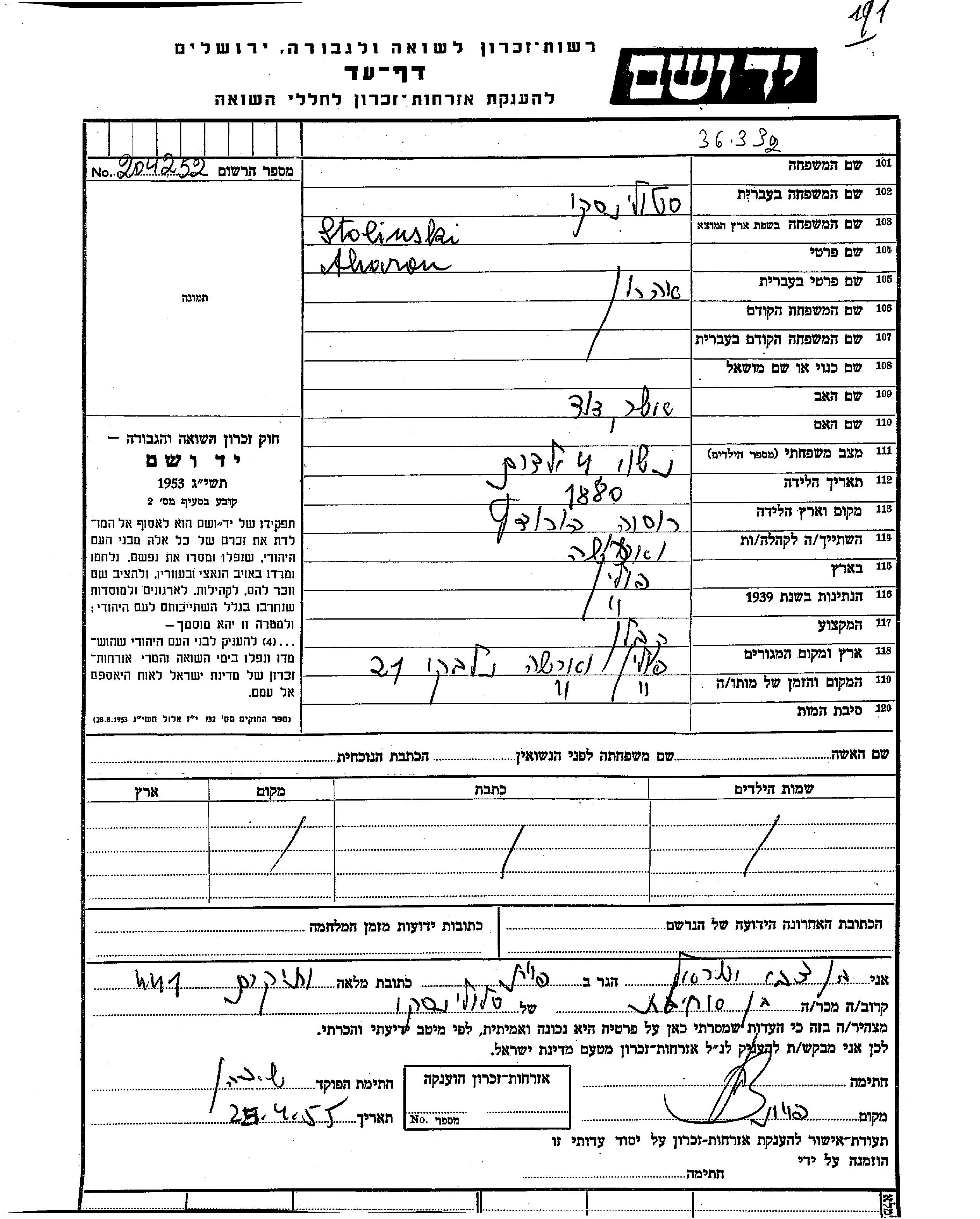 Арон Столински, место рождения: Городец, Польша. Отец: Ашер Давид. Подрядчик. Женат / замужем. Место жительства до войны: Варшава, Польша. Место во время войны: Варшава, Польша.