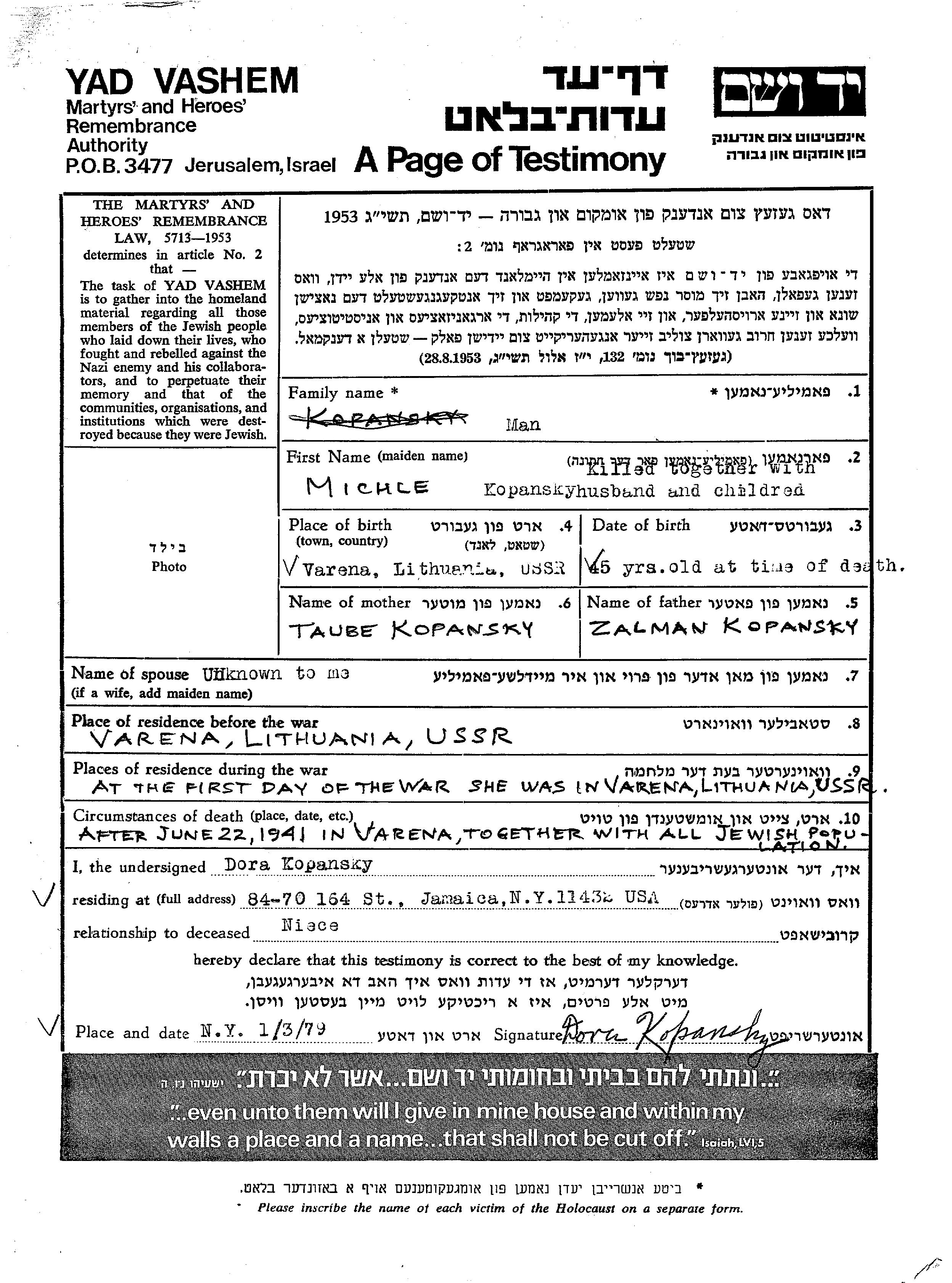 Михле Ман, место рождения: Варена, Польша. Отец: Залман, mать:Тауба. Женат / замужем. Место жительства до войны: Варена, Польша. Место во время войны: Варена, Польша.