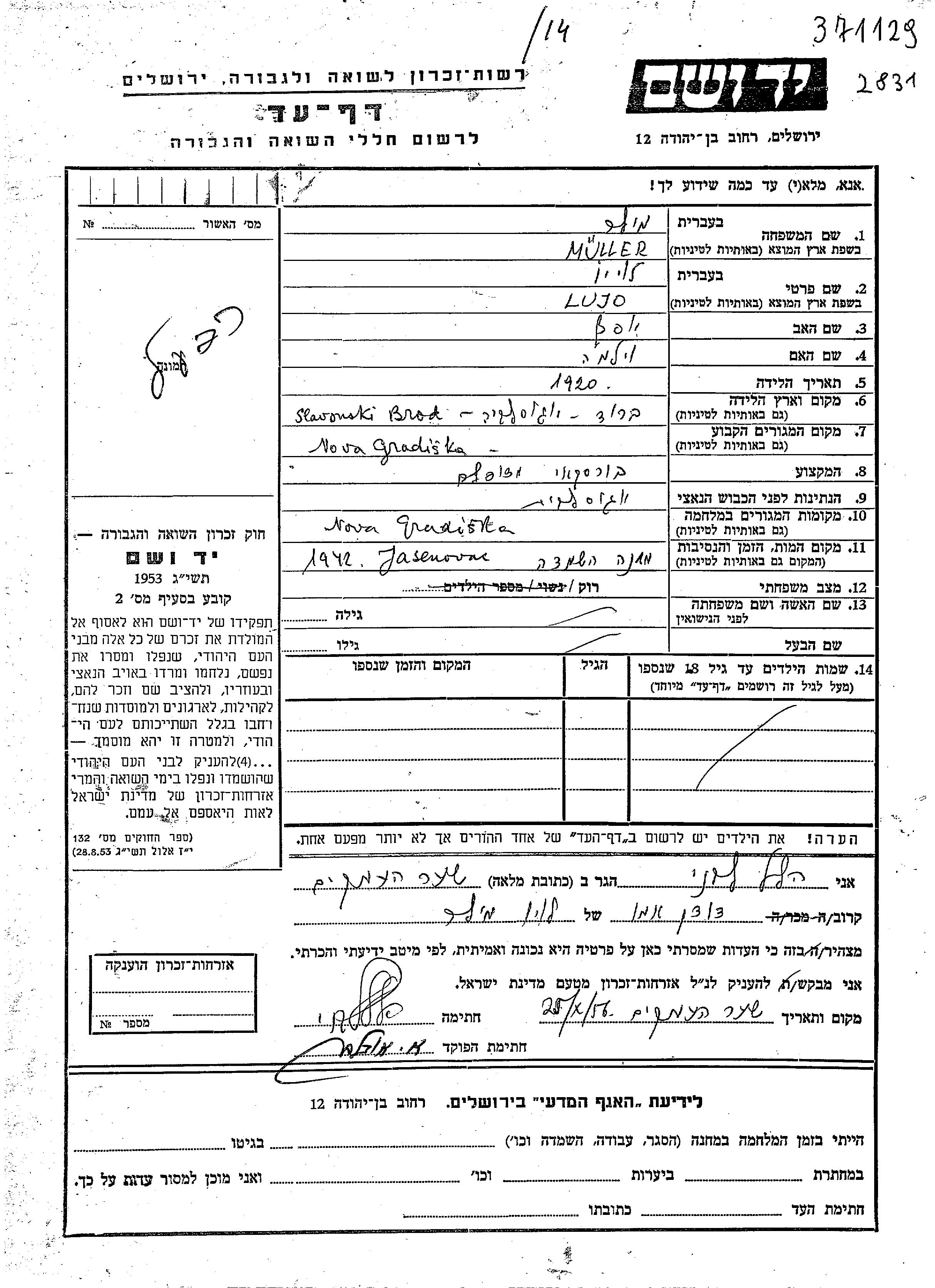 Луйо Мюллер, место рождения: Славонский-Брод, Югославия. Отец: Иосеф, mать:Вильма. Кожевник. Холост / не замужем. Место жительства до войны: Нова-Градишка, Югославия. Место во время войны: Нова-Градишка, Югославия.