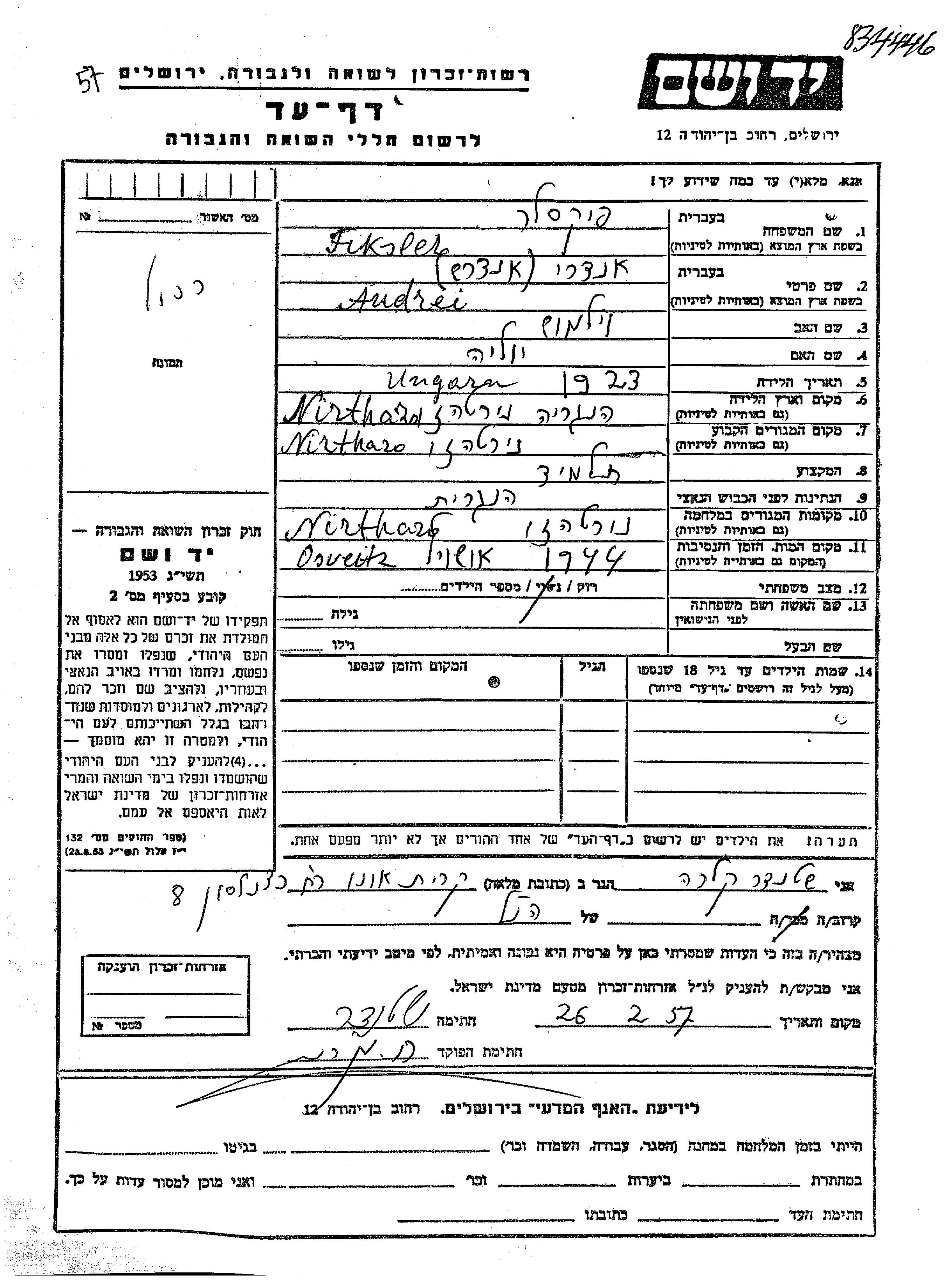 Андрей Фикслер, место рождения: Ньиредьхаза, Венгрия. Отец: Вильмош, mать:Юлия. Ученик / ученица. Холост / не замужем. Место жительства до войны: Ньиредьхаза, Венгрия. Место во время войны: Ньиредьхаза, Венгрия.