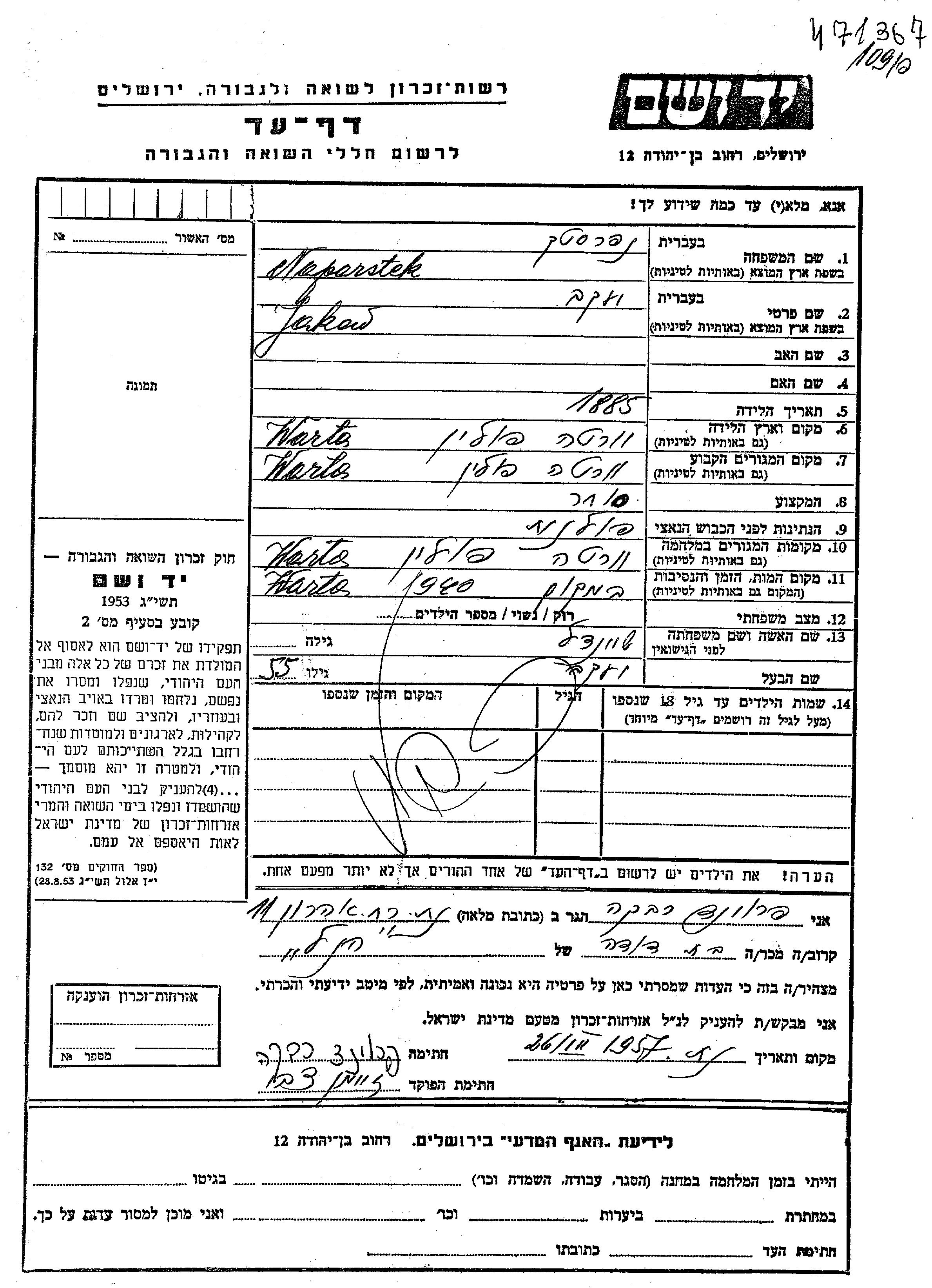 Яков Напарстек, место рождения: Варта, Польша. Торговец / торговка. Женат / замужем. Место жительства до войны: Варта, Польша. Место во время войны: Варта, Польша.