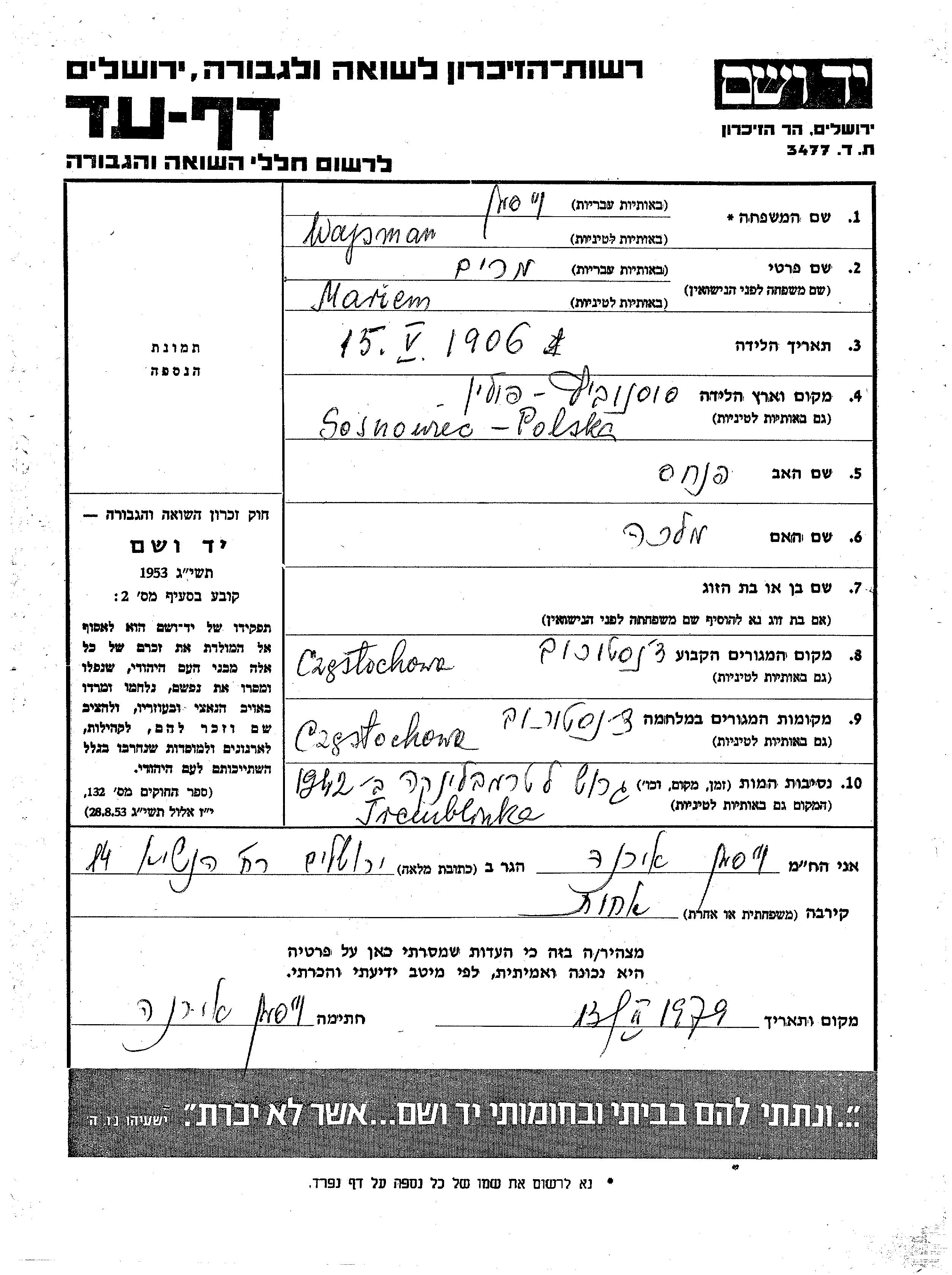 Марьем Вайсман, место рождения: Сосновиц, Польша. Отец: Пинхас, mать:Малка. Место жительства до войны: Ченстохова, Польша. Место во время войны: Ченстохова, Польша.