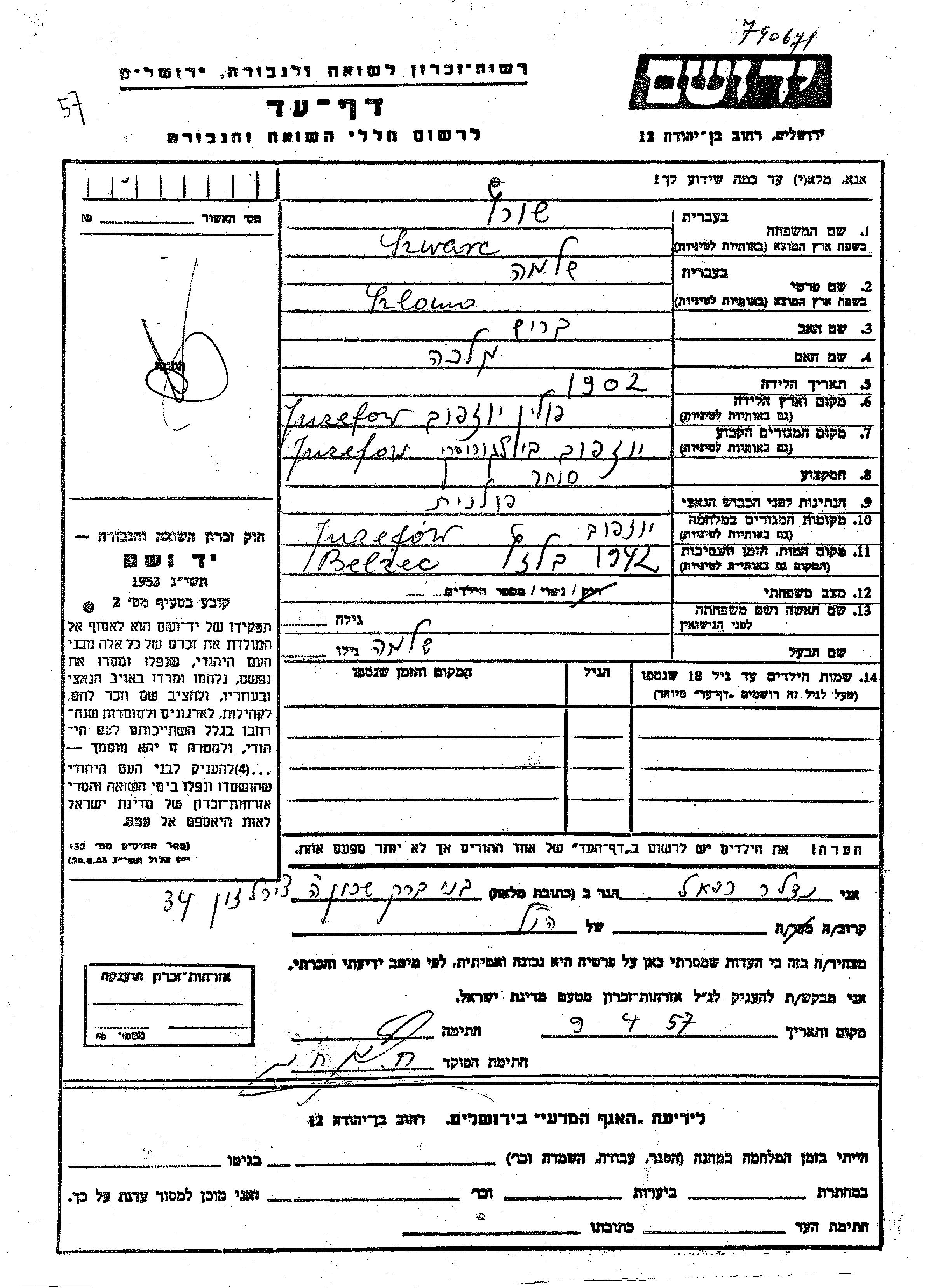 Шварц Шломо 1902 Юзефув, Польша Лист свидетельских показаний