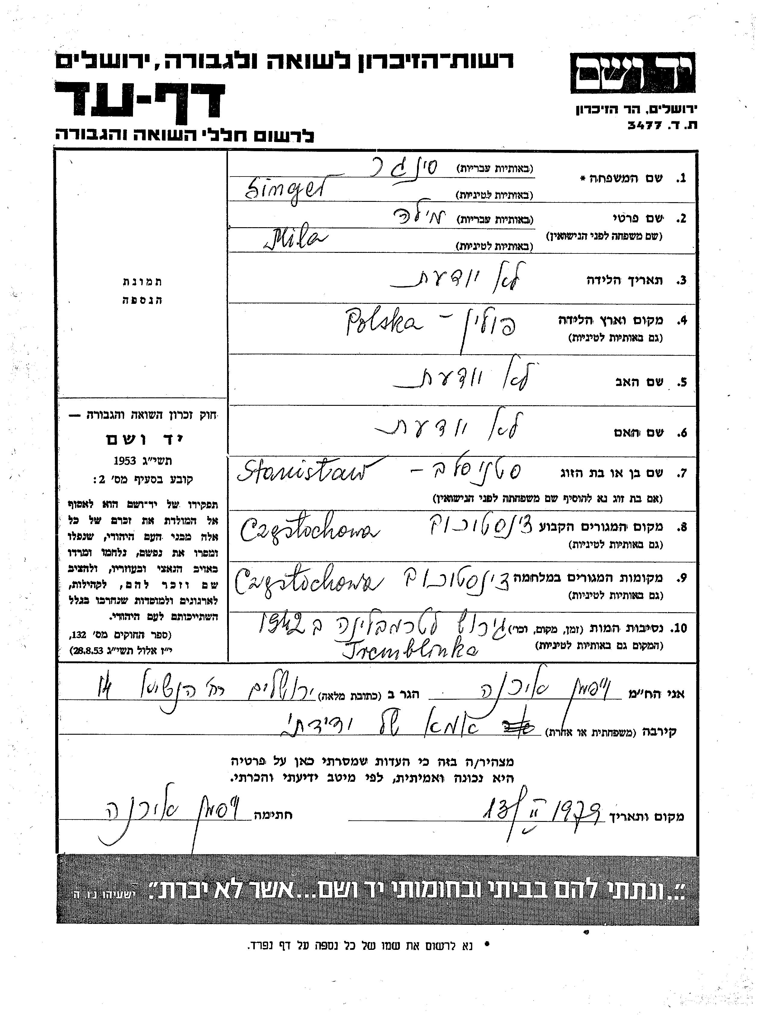 Зингер Мила Ченстохова, Польша Лист свидетельских показаний