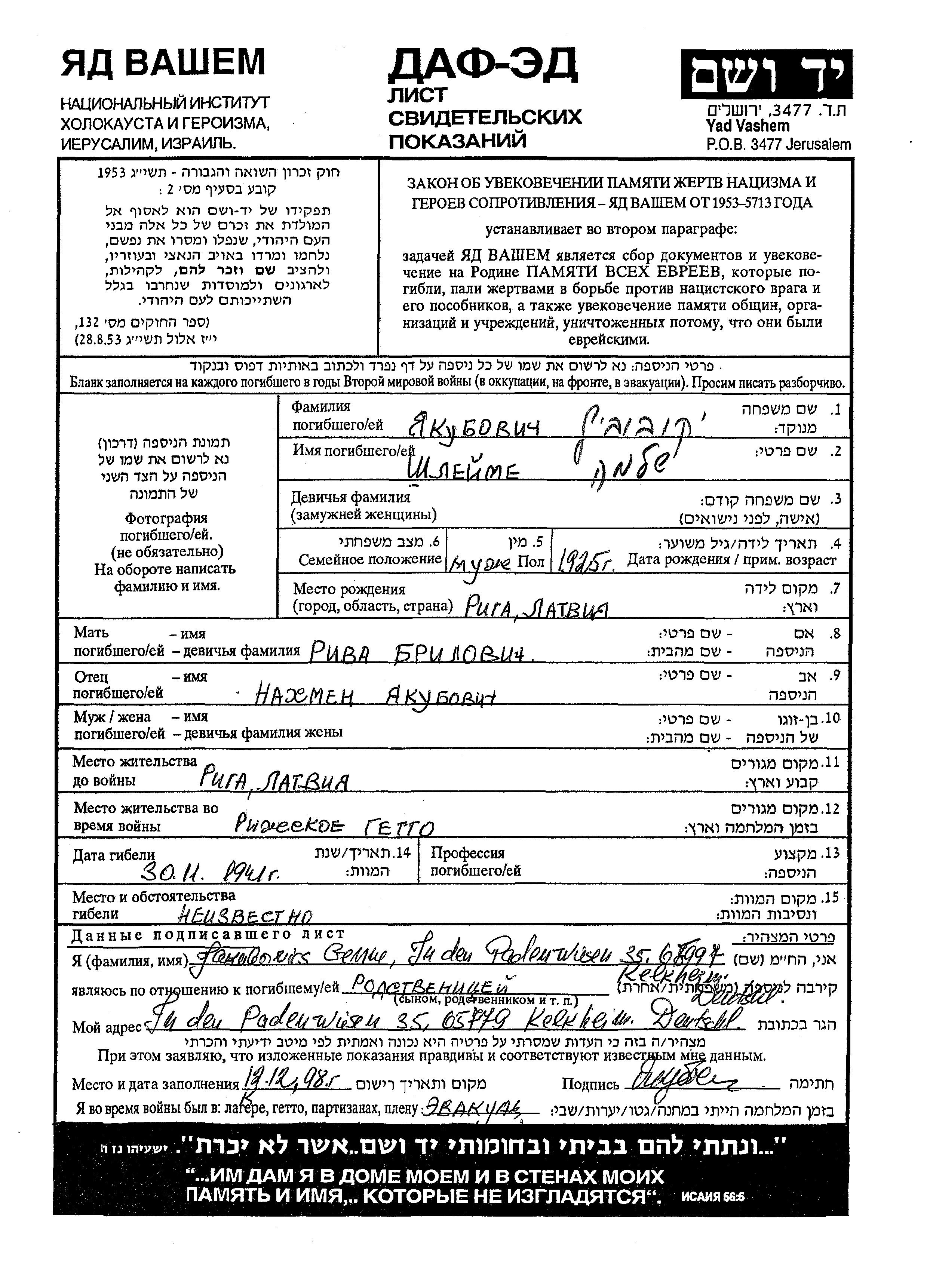 Яд Вашем - Листы свидетельских показаний Мемориального фонда