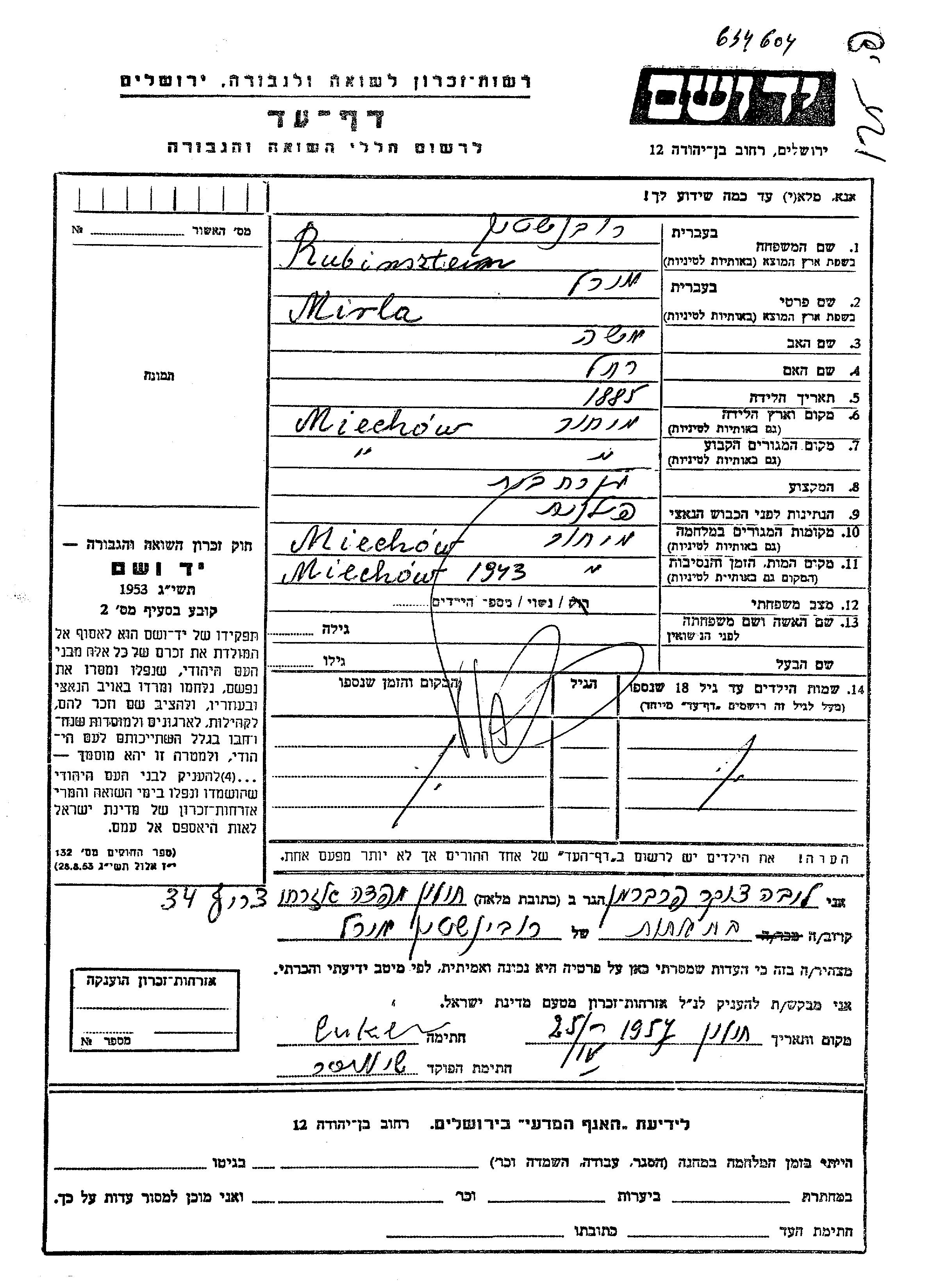 Мирла Рубинштейн, место рождения: Мехув, Польша. Отец: Моше, mать:Рахель. Домохозяйка. Женат / замужем. Место жительства до войны: Мехув, Польша. Место во время войны: Мехув, Польша.