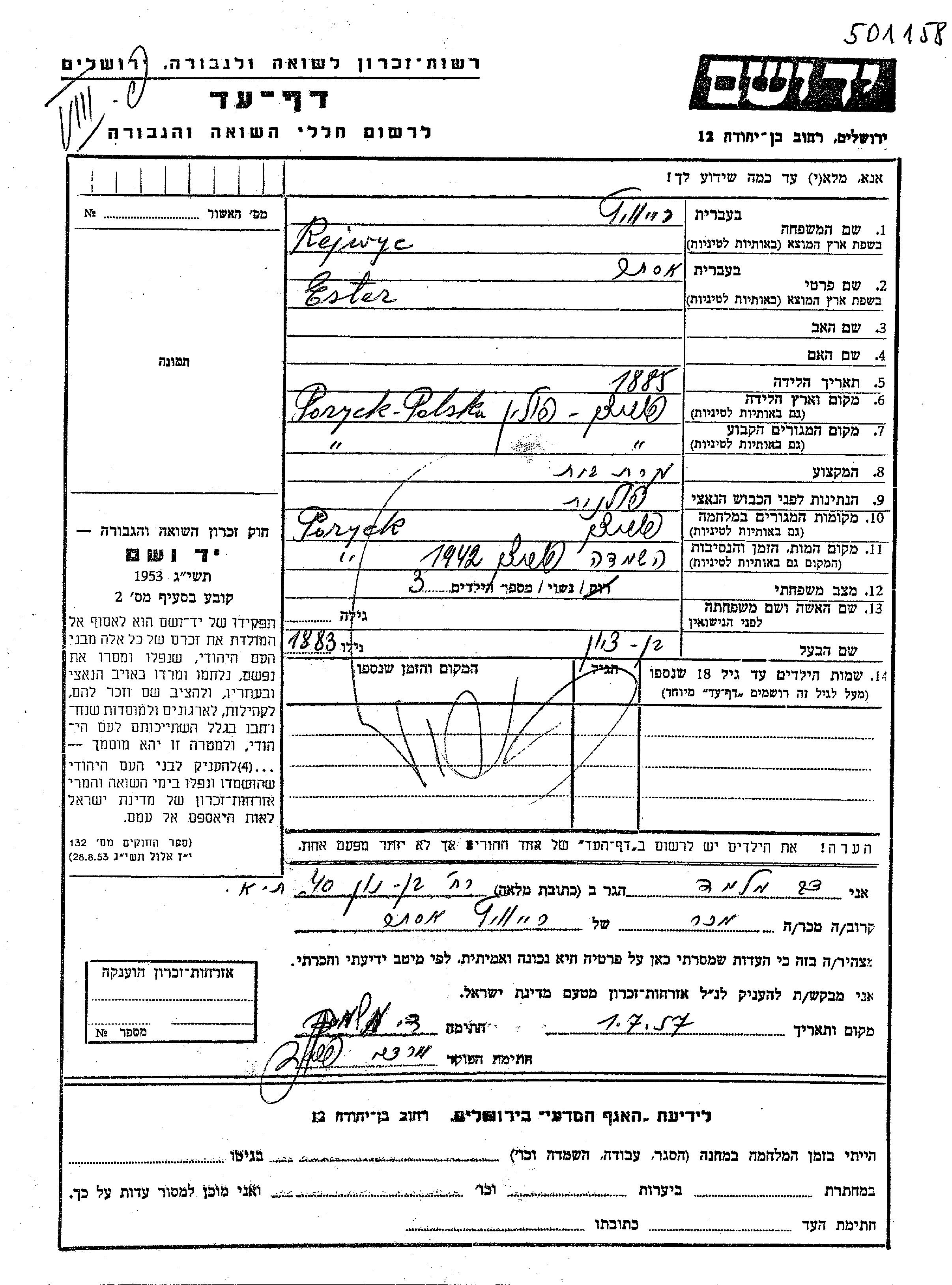 Эстер Рейвиц, место рождения: Порицк, Польша. Домохозяйка. Женат / замужем. Место жительства до войны: Порицк, Польша. Место во время войны: Порицк, Польша.