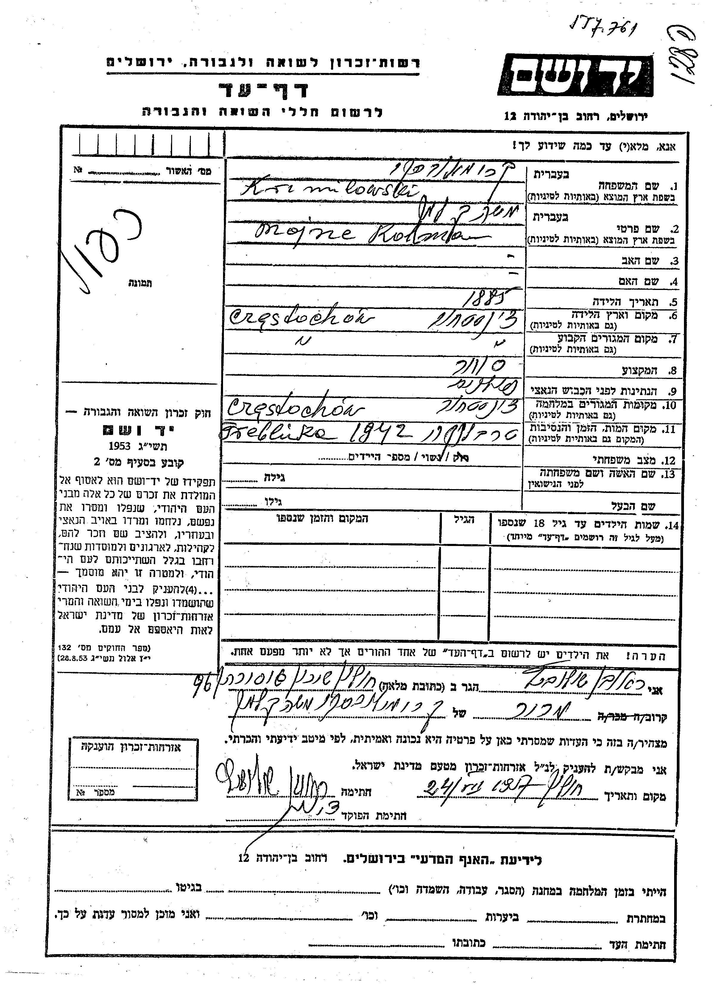 Кримиловски Мойше Кольман 1885 Ченстохов, Польша Лист свидетельских показаний