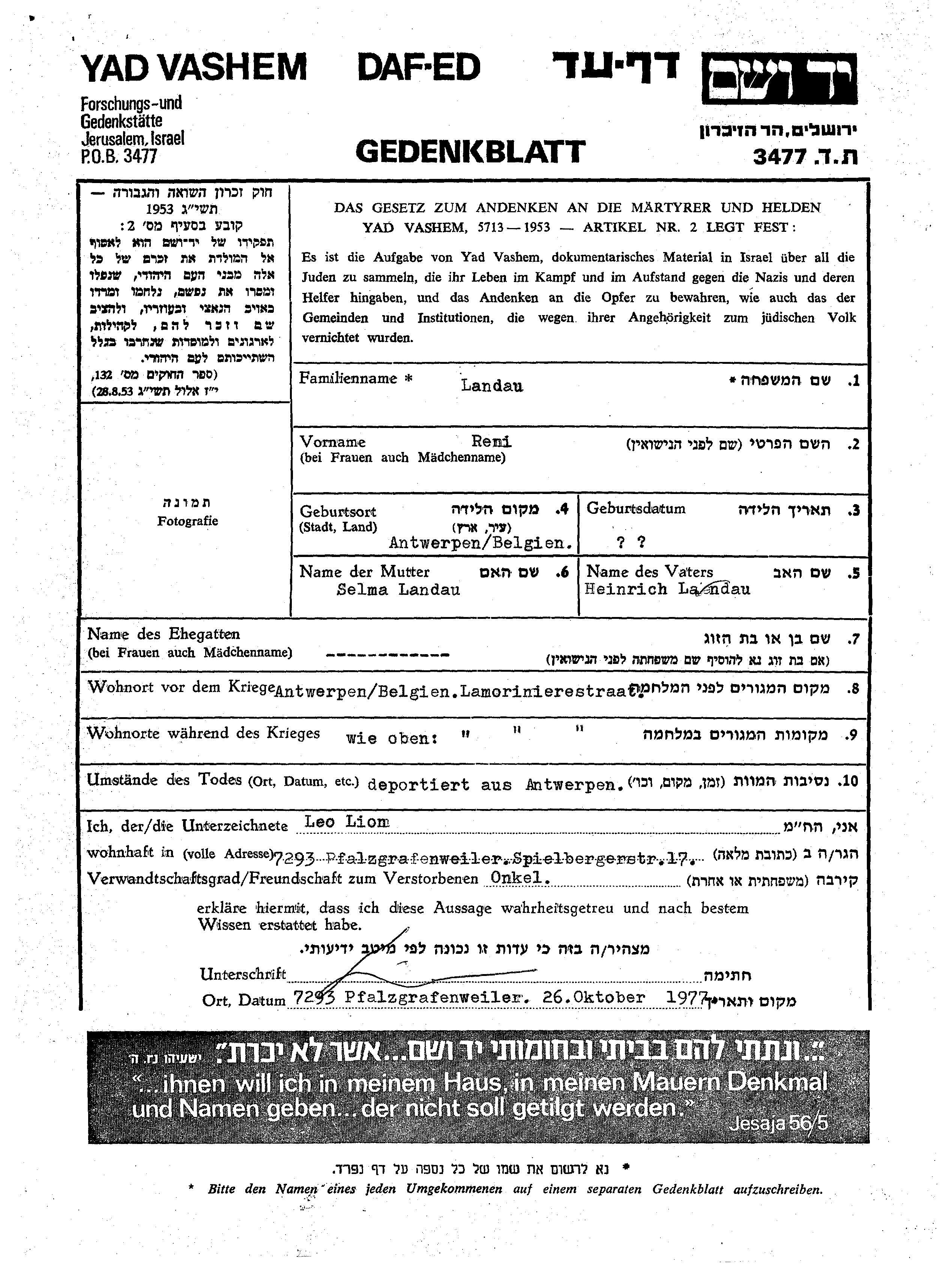 Рени Ландау, место рождения: Антверпен, Бельгия. Отец: Хайнрих, mать:Сельма. Место жительства до войны: Антверпен, Бельгия. Место во время войны: Антверпен, Бельгия.