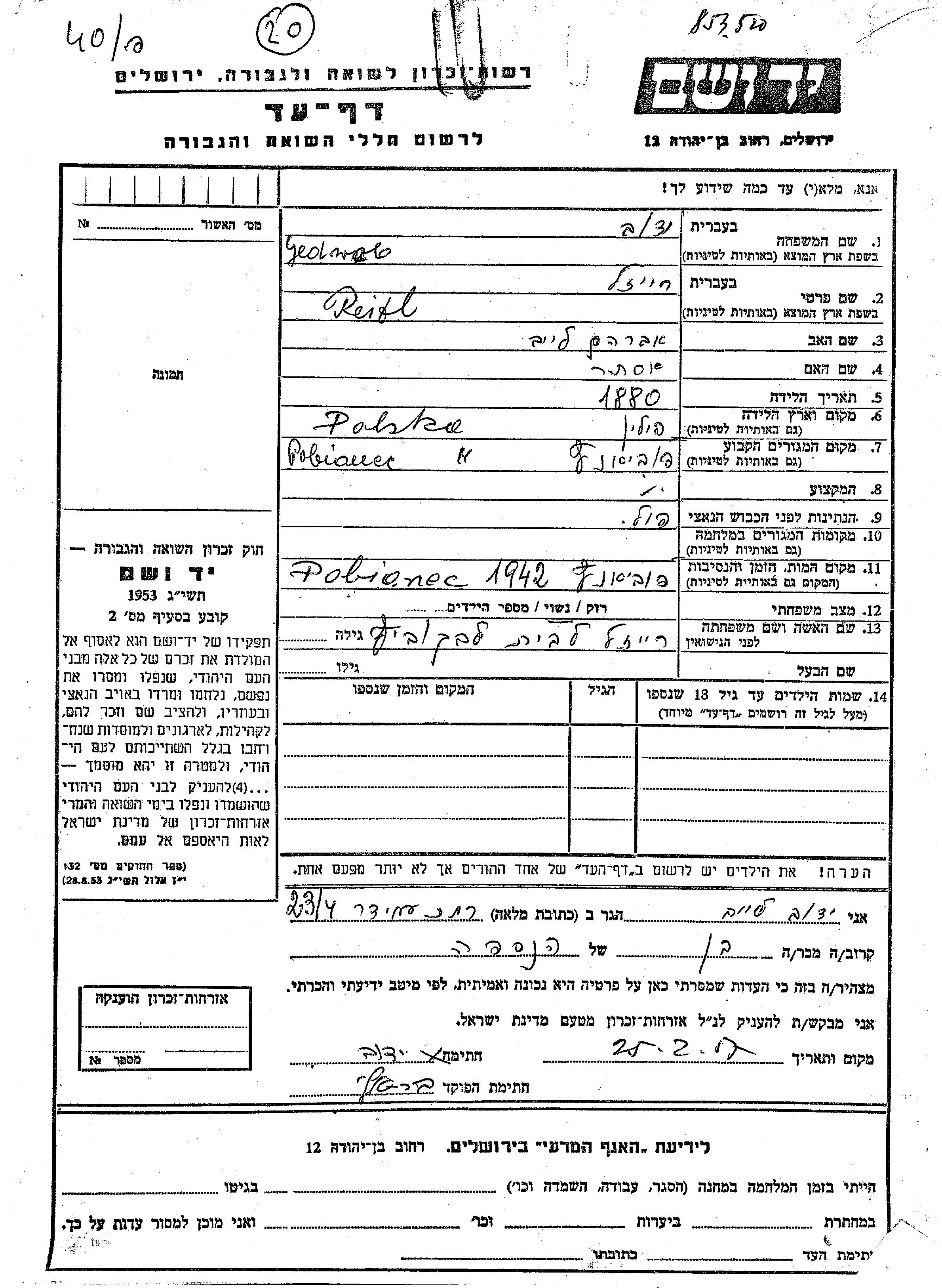 Яд Вашем - Листы свидетельских показаний Мемориального фонда