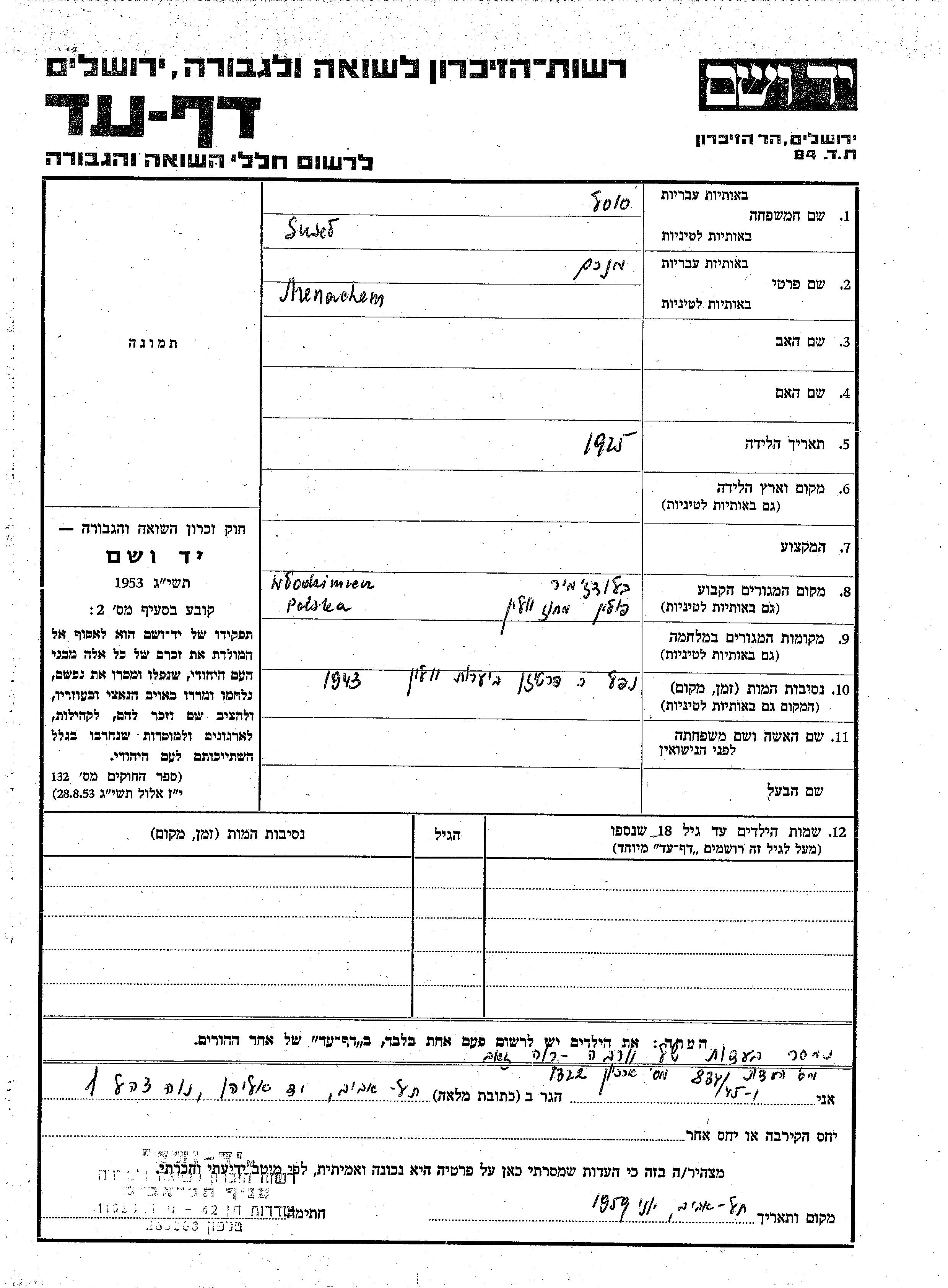 Сусель Менахем 1925 Владимир-Волынский, Польша Лист свидетельских показаний