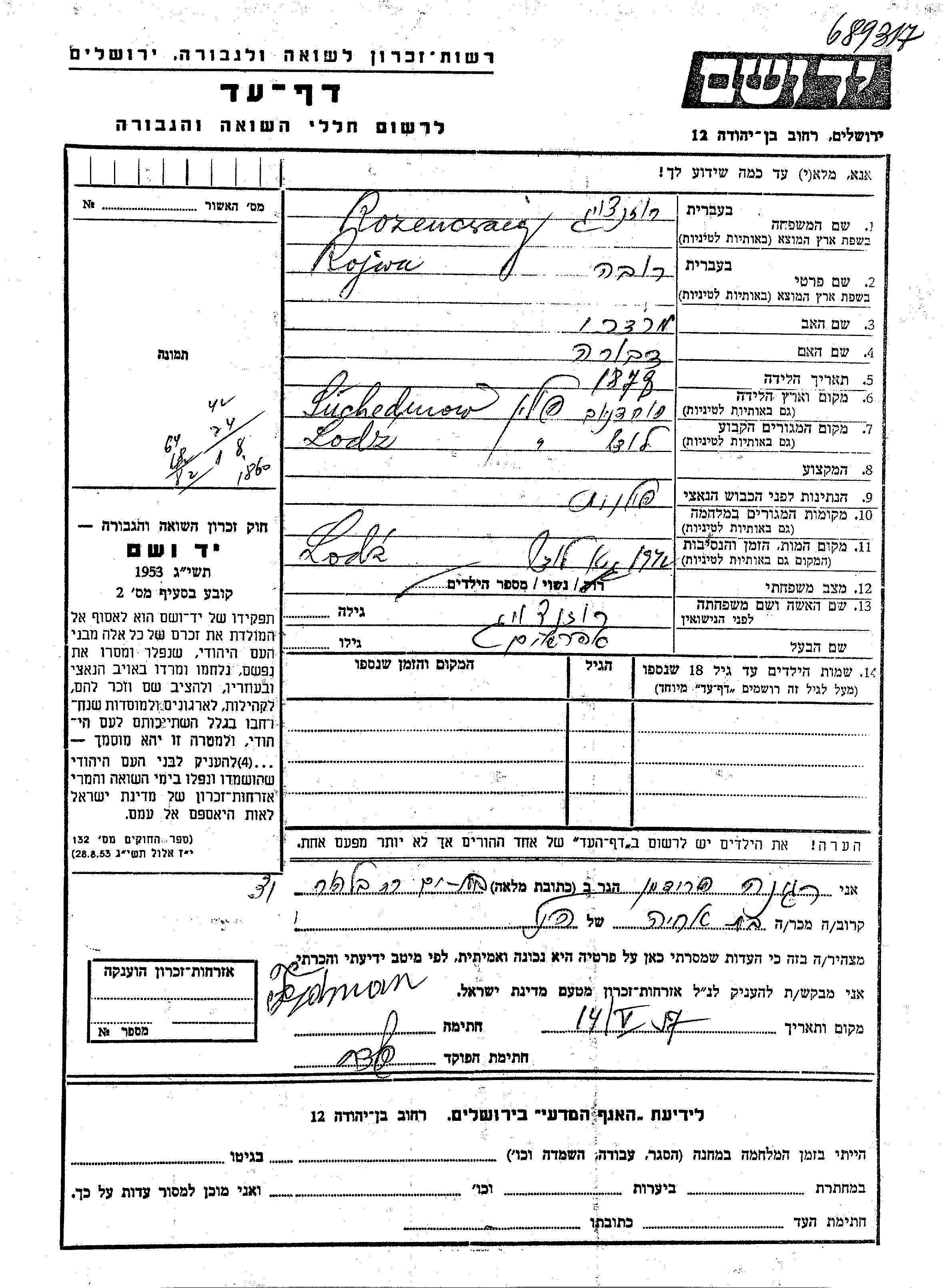Розенцвайг Реувен 1873 Лодзь, Польша Лист свидетельских показаний