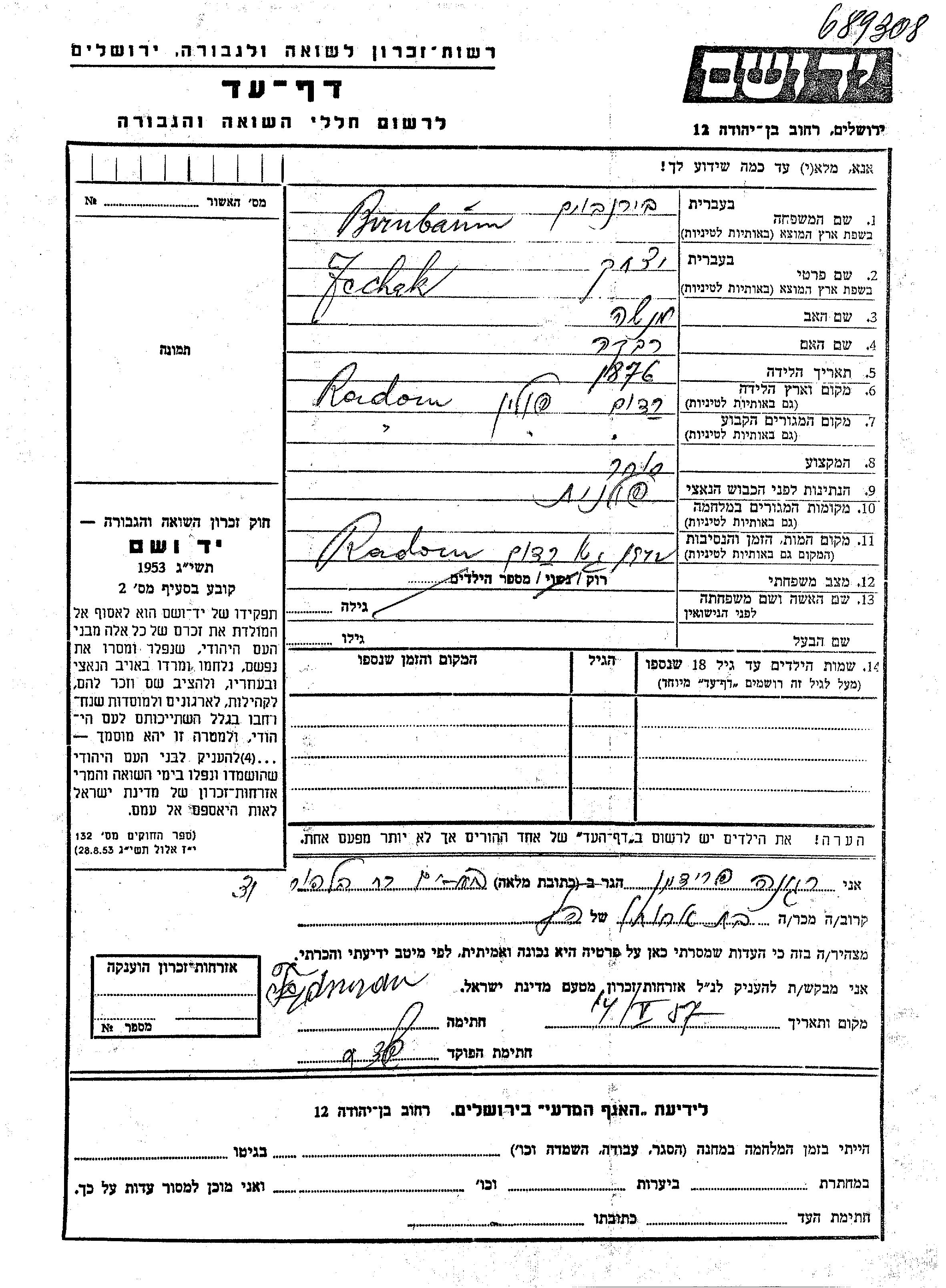 Яд Вашем - Листы свидетельских показаний Мемориального фонда