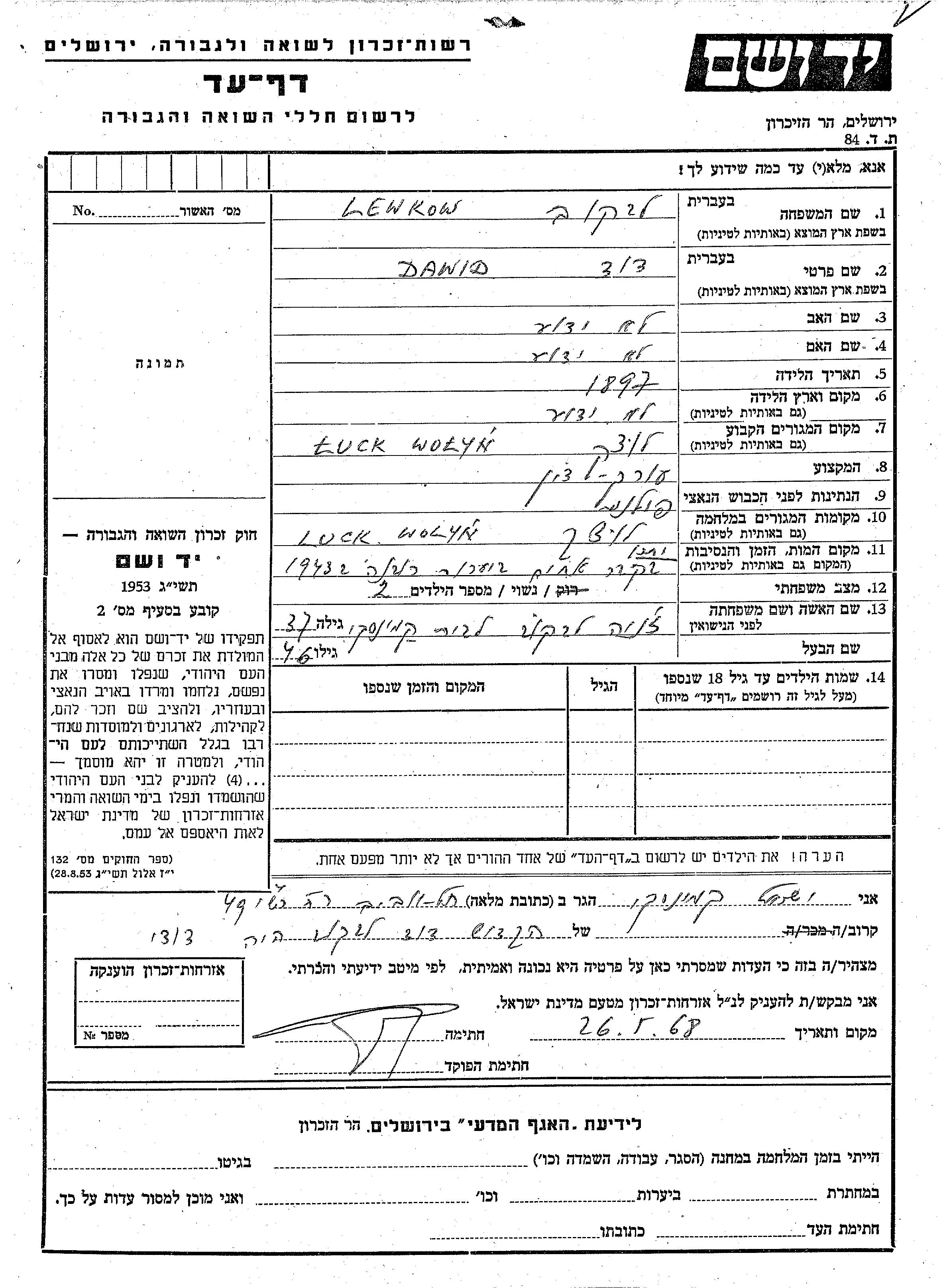 Давид Левков. Адвокат. Женат / замужем. Место жительства до войны: Луцк, Польша. Место во время войны: Луцк, Польша.
